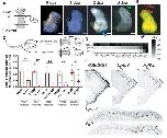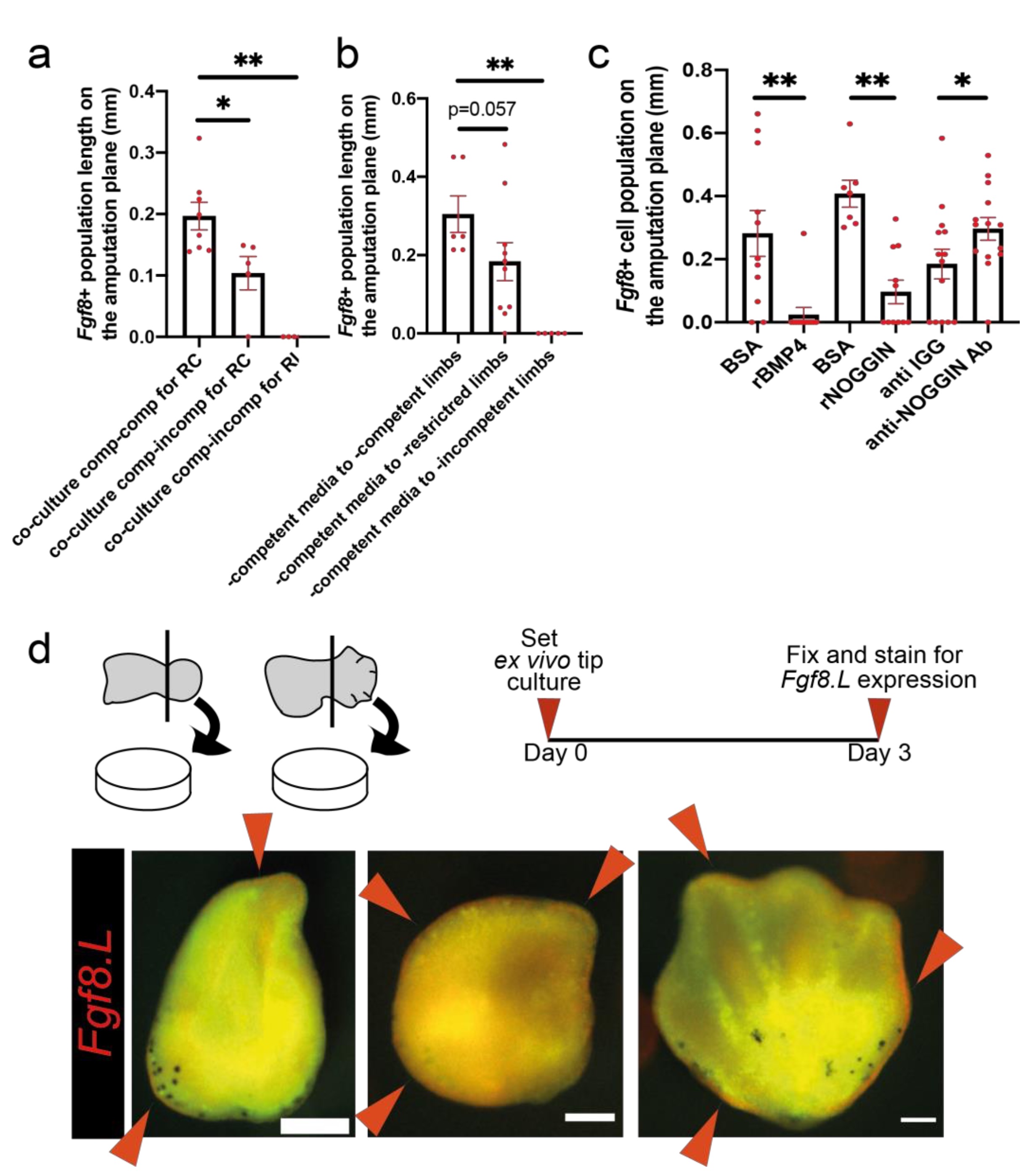 Figure S15: Secreted factors from regeneration-competent explants are not sufficient to induce Fgf8+ epidermal cells on the amputation plane of regeneration-incompetent explants, and reducing the proportion of chondrogenic lineage populations in explants can induce ectopic Fgf8+ epidermal cells. (a) Co-culturing regeneration-competent with -incompetent explants does not enable AER cell formation ability in -incompetent explants. RC: regeneration-competent; RI: regeneration- incompetent. Co-culture of regeneration-competent-competent and assess âcompetent: total n=8, from 2 biological replicates, Co-culture regeneration-competent-incompetent and assess âcompetent: n= 5 from 2 biological replicates. Co-culture regeneration-competent-incompetent for -incompetent total n= 6 from 2 biological replicates. P*< 0.05, and P**< 0.001. (b) Treatment with âcompetent conditioned media does not enable AER cell formation in incompetent explants. Adding -competent-media to âcompetent explants: total n=6, from 2 biological replicates. Adding -competent-media to ârestricted explants: n= 10, from 3 biological replicates. Adding -competent-media to âincompetent explants: n= 5, from 1 biological replicate. P**< 0.001. (c) Regeneration-competent explants were treated with recombinant BMP4, recombinant NOGGIN, or anti-NOGGIN antibodies. Contralateral limbs were used as controls and treated with vehicle solutions (0.1% BSA, or anti-IGG). Recombinant BMP4 or NOGGIN additions block AER cell formation. Anti-NOGGIN antibody treatment enhances AER cell formation. From left to right 0.1% BSA: total n=11 from 3 biological replicates; rBMP4: total n= 12 from 3 biological replicates; 0.1% BSA: total n=7 from 2 biological replicates; rNOGGIN: total n=11 from 2 biological replicates; anti-IGG antibody: total n=14 from 4 biological replicates; anti-NOGGIN antibody: total n=14 from 4 biological replicates. Each sample group compared to their contralateral group to assess statistical significance. P*< 0.05, and P**< 0.001. (d) (Top) Schematic describing the protocol for culturing distal limb buds (NF stage ~52) and early autopods (NF Stage ~54). Tip explants were cultured for 3 days in explant media, and assessed for Fgf8.L expression. (Bottom) Tip cultures show ectopic Fgf8.L expression as assessed by whole-mount stereomicroscope HCR staining for Fgf8.L. Red arrows show Fgf8.L expression regions. Ectopic AER formation is seen in total 16/18 cases from 2 biological replicates. Red, Fgf8.L mRNA. Scale= 100 μm. |