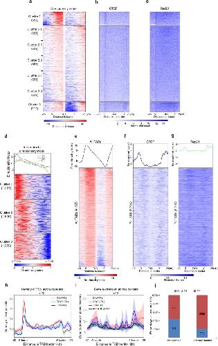 Fig. 3: Orientation-biased CTCF and Rad21 enrichment at TAD borders of higher DI values. a, DI for three clusters of TADs identified in embryos at s13: 555, 3,191 and 414 TADs in clusters 1, 2 and 3, respectively. b, CTCF enrichment is biased to borders with higher DI values. c, Rad21 enrichment is biased to borders with higher DI values and drops toward the border on the other side of the TAD. aâc, Data are presented as the meanâ±âs.e.m. d, DI for TADs of cluster 1, five subclusters of clusters 2 and cluster 3. According to the ranking of DI strength, TADs in cluster 2 were divided into five subclusters. Data are presented as box plots within violin plots. The minima, maxima, center and bounds of each box plot refers to quartile 1â1.5 interquartile range, quartile 3â+â1.5 interquartile range, median, first and third quartiles of the data. e, Examples of TADs for the three different clusters. f, Aggregated heatmaps for three clusters of TADs. g, Histone modifications and p300 enrichment patterns across the borders of three clusters of TADs. Data are presented as the meanâ±âs.e.m. |