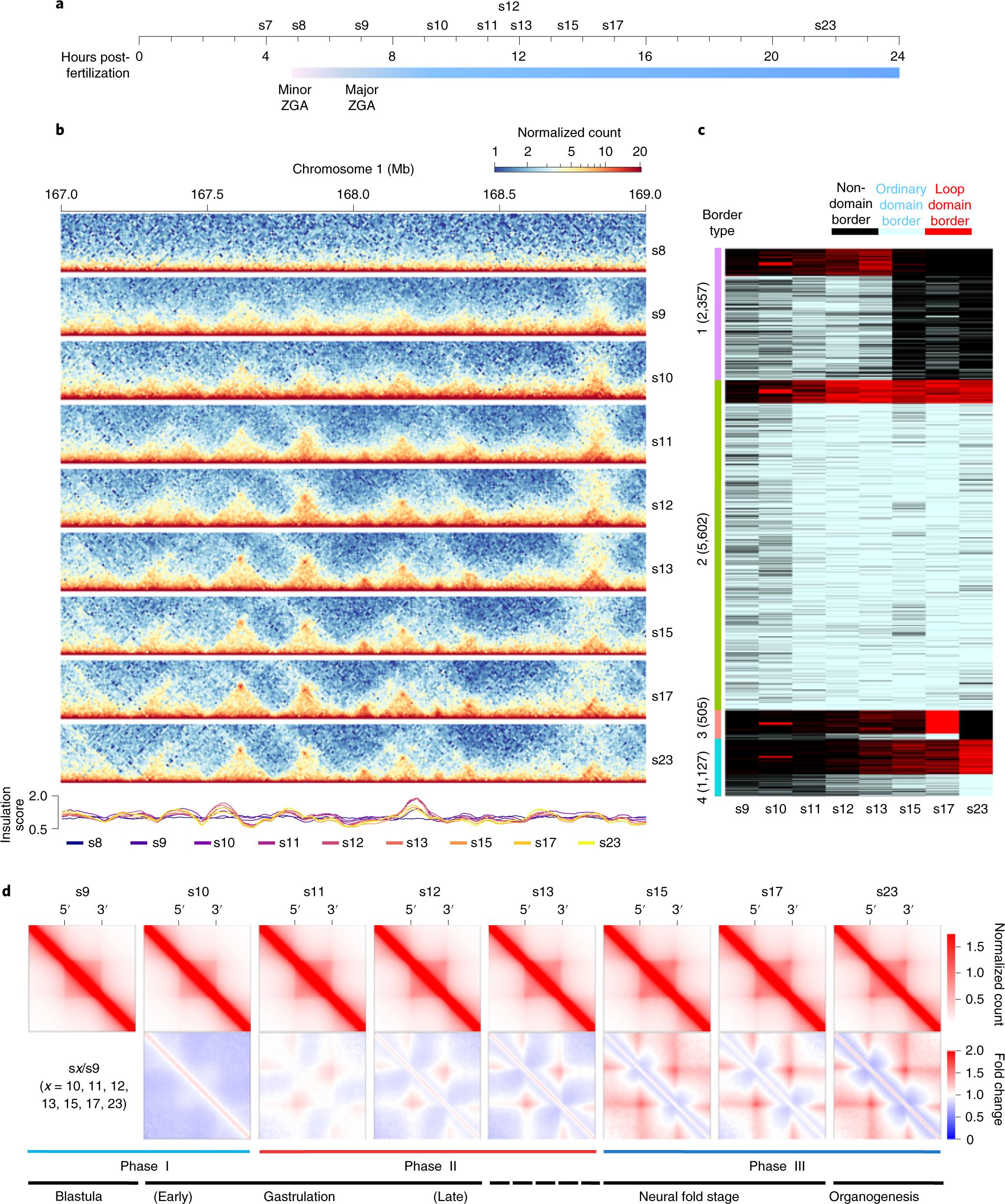 Fig. 2: De novo TAD establishment during embryogenesis of X. tropicalis. a, Schematic representation of the ten developmental stages examined by in situ Hi-C. b, Chromatin interaction frequency mapped at a 5-kb resolution. c, Clusters of TAD borders appear for ordinary domains (light blue), loop domains (red) and non-domains (black) at each specific developmental stage. âNon-domain borderâ refers to a genomic region not identified as a TAD border at a specific embryonic developmental stage, which switches to a TAD border at other development stages. d, Heatmaps of aggregated TADs for the eight developmental stages. The interaction frequency of aggregated TADs from s10 to s23 was normalized against s9. Three phases of change in the TAD structure are shown below, with the developmental stages also shown (TAD number at s9, s10, s11, s12, s13, s15, s17 and s23: 2,471, 2,805, 3,599, 4,036, 4,160, 3,164, 3,609 and 3,199). |