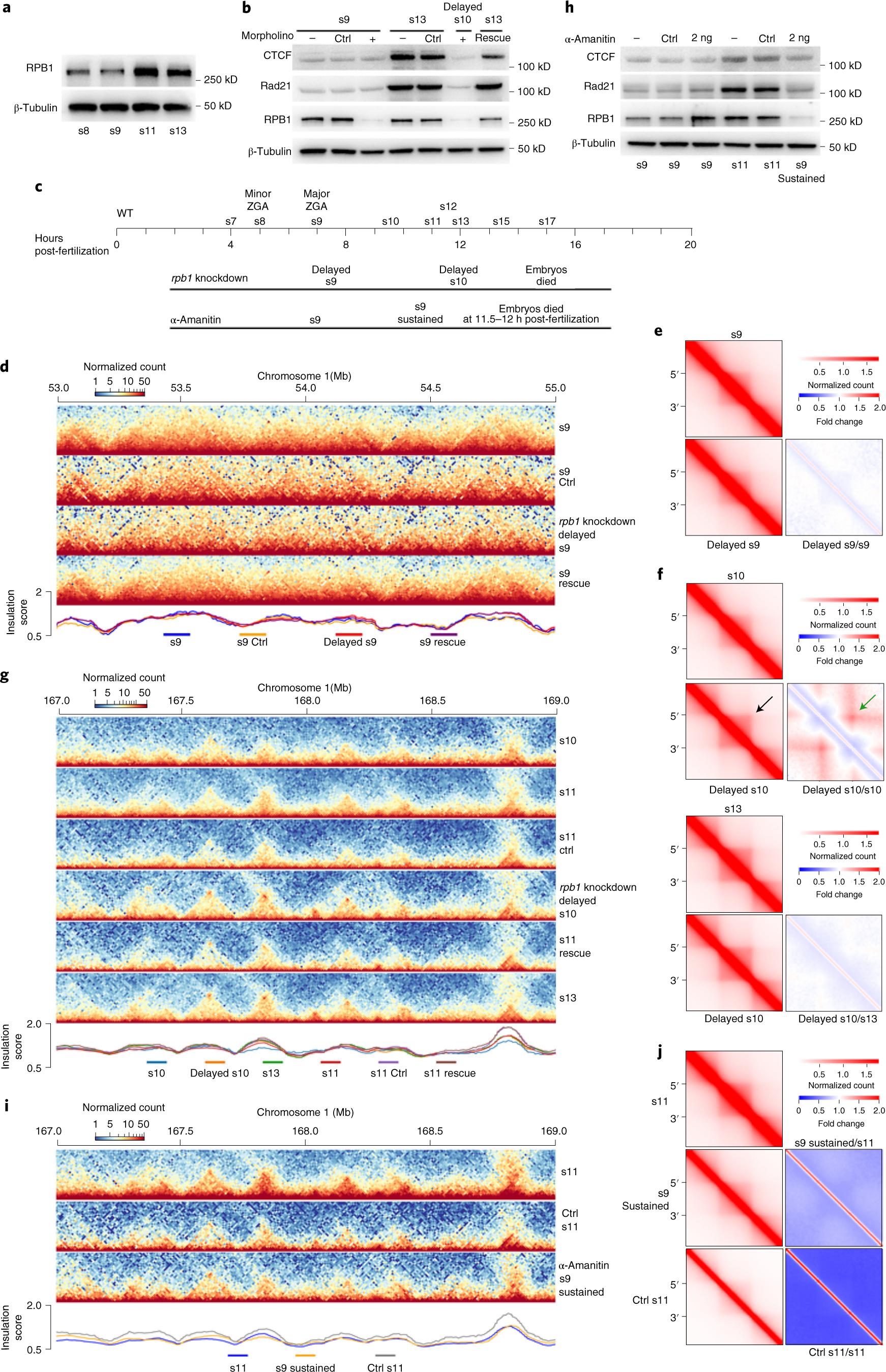 Fig. 4: De novo TAD establishment is independent of transcription. a, Western blot of RPB1 in WT embryos at the four developmental stages. b, Western blot of proteins in embryos with RPB1 knocked down by morpholinos and in embryos that were rescued. Note that the CTCF and Rad21 protein levels at delayed s10 were similar to s9 WT. Morpholino control (Ctrl); no morpholino (â); rpb1 morpholino (+); rpb1 rescue. See also Supplementary Table 4 for the rpb1 coding sequence for the rescue experiment. c, Schematic representation of the embryogenesis process arrested by RPB1 knockdown and transcription inhibition by α-amanitin. d, Example of a region showing the RPB1 knockdown effects on TAD structure at s9. e,f, Aggregated and normalized heatmaps for s9 and delayed s9 (e), and s10, s13 and delayed s10 (f) for the RPB1 knockdown experiment. g, Example of a region showing the RPB1 knockdown and rescue effects on TAD structure at s11. h, Western blot of proteins in embryos inhibited with α-amanitin. Note that the CTCF and Rad21 protein levels at s9 sustained were similar to s9 WT. Water as control (Ctrl); no α-amanitin (â); the amount of α-amanitin injected was 2âng per embryo. All western blot experiments in this figure were repeated at least twice unless otherwise stated. i, Example of a region showing the effects of α-amanitin inhibition on TAD structure. j, Aggregated and normalized TAD analysis for embryos of WT s11 and α-amanitin-inhibited s9 sustained. |