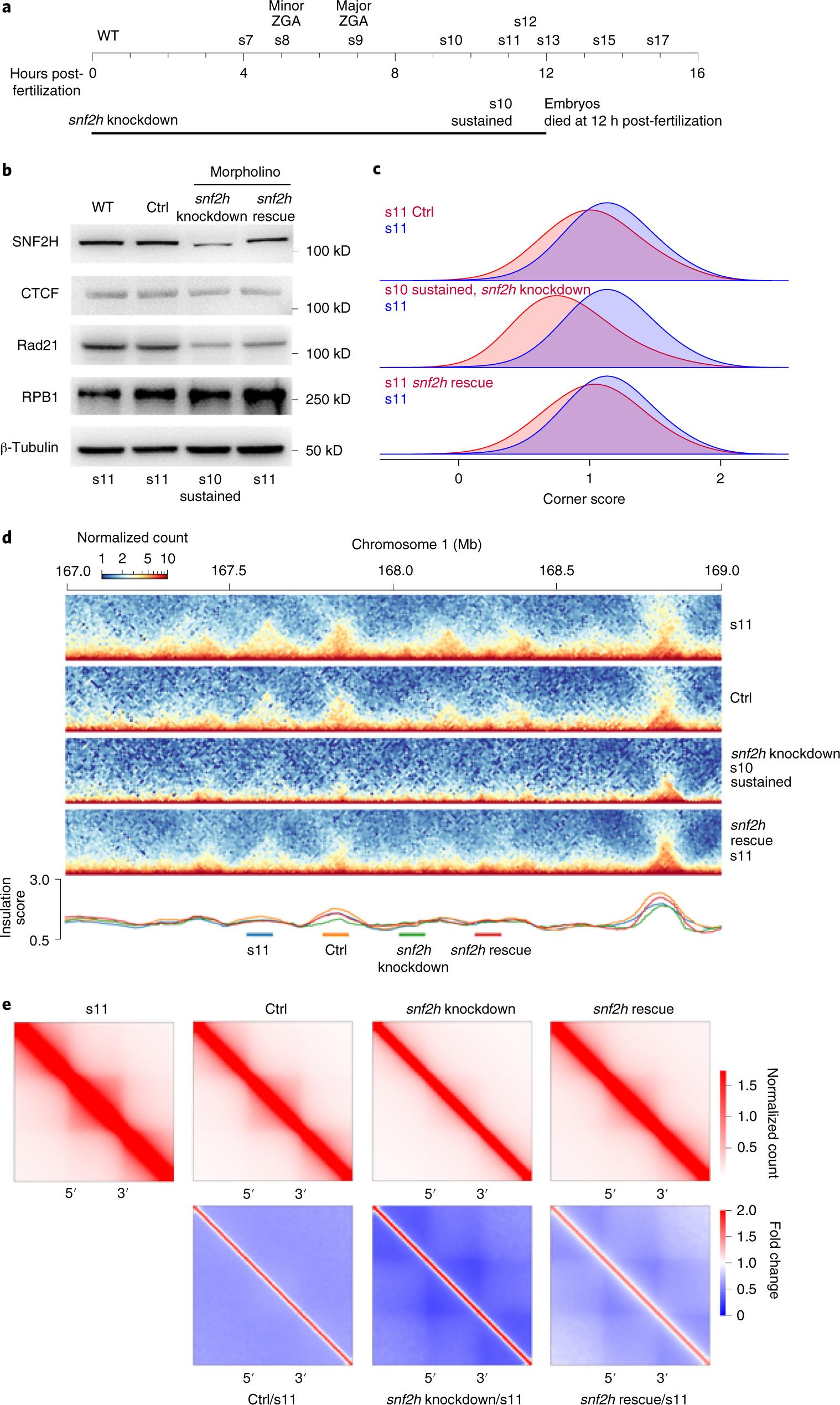 Fig. 6: Chromatin remodeling is required for TAD establishment and embryo development. a, Schematic representation of the embryogenesis process arrested by the knockdown of SNF2H, the ATPase component of the ISWI complex. b, Western blot of proteins in embryos with SNF2H knocked down by morpholinos and in embryos that were rescued. WT, morpholino control (Ctrl), SNF2H morpholino (snf2h knockdown), SNF2H rescue (snf2h rescue). The western blot experiments in this figure were repeated at least twice with similar results. c, The domain arrowhead corner score distribution of snf2h knockdown embryos. Morpholino control (Ctrl). d, Example region to show snf2h knockdown and rescue effect on TAD establishment. e, Heatmaps of aggregated TADs normalized against s11. |