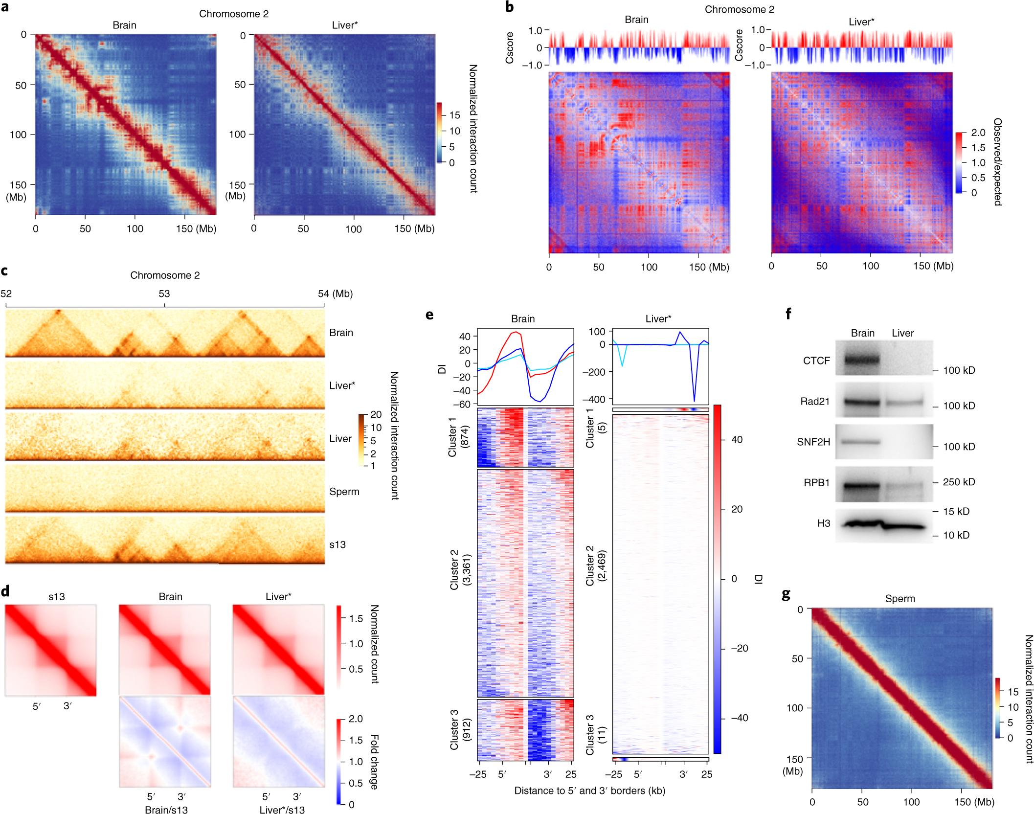 Fig. 8: Tissue-specific genome architecture in mature brain, liver and sperm cells. a, Heatmaps of chromosome 2 plotted at a 50-kb resolution for brain and liver cells. b, Hi-C matrices (oberved/expected) and Cscore for chromosome 2 at 50-kb resolution for brain and liver cells. c, Heatmaps of an example region in chromosome 2 showing the gain and loss of TAD structures in the brain, liver and sperm cells compared to s13. The single asterisk next to Liver indicates repeated Hi-C on liver cells with K562 as the spike-in control. d, Aggregated TADs of brain, liver and s13 embryo cells and normalization of aggregated TADs against s13 embryos. e, DI cluster for TADs of brain and liver cells. In brain cells, we identified 874, 3,361 and 912 TADs in clusters 1, 2 and 3, respectively. In liver cells, we identified 11, 2,469 and 5 TADs in clusters 1, 2 and 3, respectively. f, Western blot of CTCF, Rad21, SNF2H, RPB1 and histone H3 as a control in brain and liver cells. The western blot experiments in this figure were repeated at least twice with similar results. g, Heatmap of chromosome 2 plotted at a 50-kb resolution for mature sperm cells. |