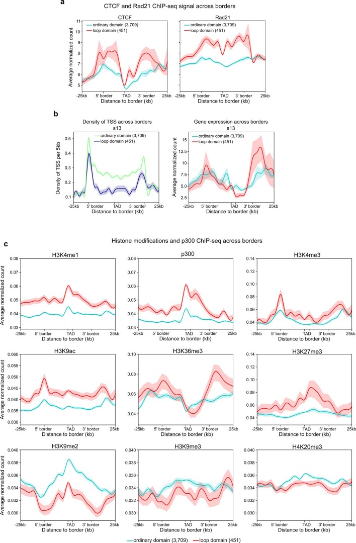 Extended Data Fig. 4. TAD analysis at different developmental stages.a, CTCF and Rad21 binding across loop domain and ordinary domain borders. b, TSS density and gene expression level across loop domain and ordinary domain borders. c, Histone modifications and p300 ChIP-seq signals across loops and ordinary domain borders. All data in this figure are represented as mean±SEM. |
