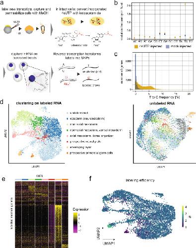 Fig. 3. Single-cell RNA labeling in early zebrafish embryos.a Schematic representation of the protocol: 4sUTP (4-thiouridine-triphosphate) injection into zebrafish one-cell stage embryos, dechorionation, dissociation into single cells at gastrulation stage, and MeOH (methanol) fixation (see “Methods” section). Incorporated 4sUTP is converted in a SN2 reaction with iodoacetamide into a cytosine analog. The single-cell solution is then loaded onto 10× Genomics Chromium, and chemical labels lead to T-to-C conversions during reverse transcription. b Nucleotide mutation frequencies of a scSLAM-seq library after injecting 4sUTP or Tris and quality filtering of the data. c Histogram of T-to-C mutations in 4sUTP- and Tris-injected embryos. d UMAP representation of cells based on labeled RNA (left side) and unlabeled RNA (right side). For the latter, we imposed cell identities as determined on the basis of labeled RNA. e Marker gene expression of labeled cells in different cell types (color code as in d). Cell number per cluster was downsampled to equal numbers. f Transcript labeling efficiency in single cells in percent, projected on the UMAP representation for labeled RNA. |
