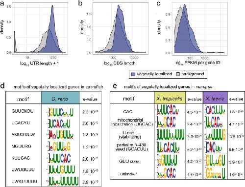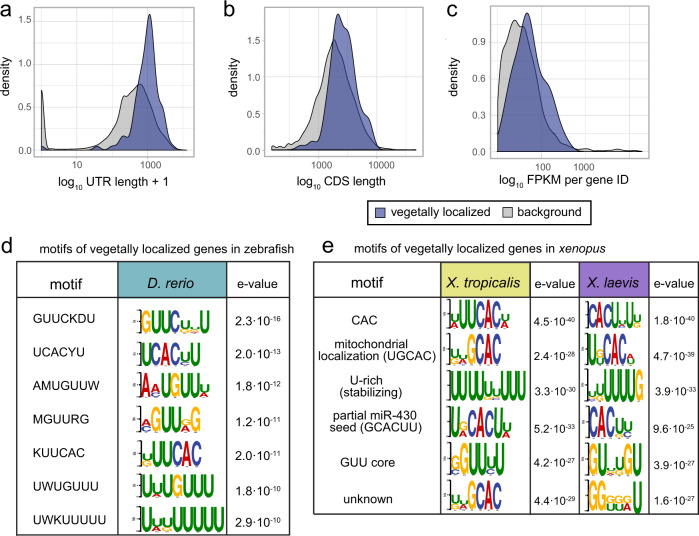 Fig. 6. 3â²UTR characteristics of vegetally localized genes.aâc Comparison of sequence characteristics of expressed isoforms of vegetally localized to all genes. a Weighted 3â²UTR (untranslated region) lengths: isoforms contribute according to their relative expression, mean(vegetal genes)â=â1.06âkb, mean(background)â=â0.6âkb, p valueâ<â2.2âÃâ10â16 (two-sample Wilcoxon test). b Weighted lengths of coding sequences (CDS), mean(vegetal genes)â=â2.78âkb, mean(background)â=â2.42âkb, p valueâ=â7.655âÃâ10â14 (two-sample Wilcoxon test). c FPKM (fragments per kilobase of transcript per million mapped reads) sum per gene ID, IDs with <10 FPKM were omitted. Mean expression of vegetal genes 64.1 FPKM, mean of background 37.4, p valueâ<â2.2âÃâ10â16, (two-sample Wilcoxon test). d Results of the k-mer enrichment analysis of 3â²UTRs of 216 expressed isoforms, zebrafish vegetally localized genes. Top seven motifs and logos. e Results of the k-mer enrichment analysis of the longest 3â²UTR of vegetally localized genes in X. laevis and X. tropicalis, top six motifs, and their respective description based on previous publications. |