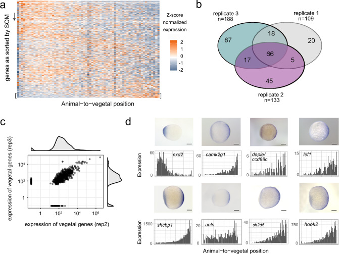 Fig. 2. Systematic identification of mRNA localization patterns.a Heatmap representation of z-score normalized expression per section in a zebrafish one-cell stage embryo. Genes on the y-axis as sorted into profiles 1â50 by SOM (self-organizing map), spatial position in the embryo on the x-axis. b Vegetally localized genes per sample (profiles 48â50). c Expression correlation of vegetally localized genes between two replicates. Genes on the axes are only detected in one sample. d Comparison of tomo-seq and whole-mount in situ hybridization for selected newly described vegetally localized genes, as well as the animally localized gene exd2. Scale bars are 200âµm. |
