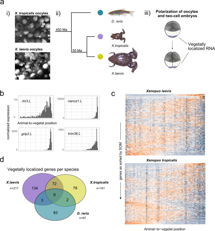 Fig. 5. Evolutionary conservation of vegetal mRNA localization.a (i) Light microscopy view of whole oocyte lobes from X. laevis and X. tropicalis before dissociation for one of the two replicates. Scale bar are 500âµm. (ii) Phylogenetic distance of Xenopus species and zebrafish as described in ref. 74 (Ma: million years). (iii) Deposition of germ plasm and dorsal factors (as purple dots) in Xenopus oocytes and after first cell division. b Tomo-seq tracks of vegetally localized genes rtn3.L, nanos1.L, grip2.L, and trim36.L in X. laevis. c Heatmap of z-score normalized expression per section in Xenopus oocytes. Genes on the y-axis as sorted into profiles 1â50 by SOM (self-organizing map), spatial position on the x-axis. d Overlap of vegetally localized genes in zebrafish and Xenopus species, considering only genes that were expressed in all three species at the respective developmental stage. |