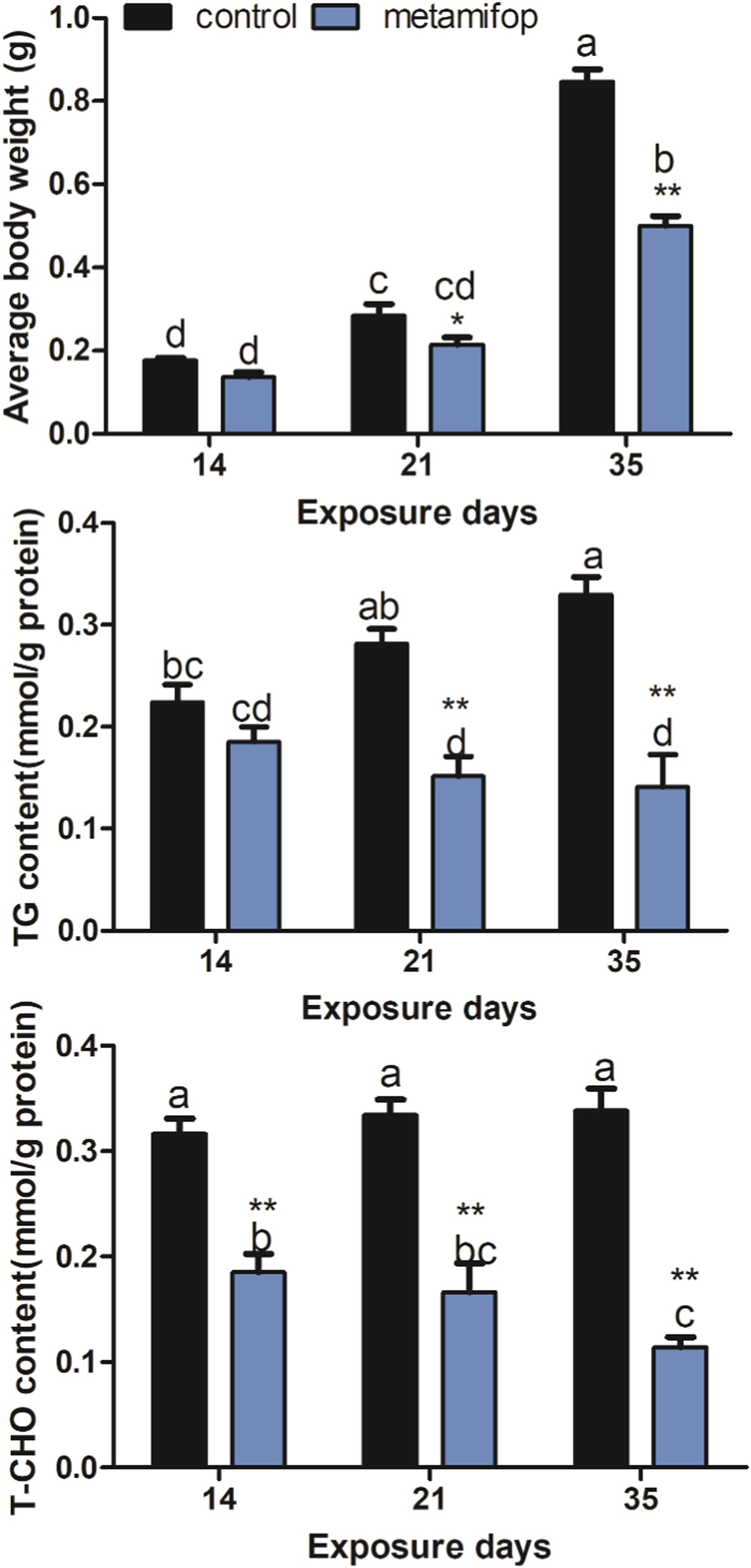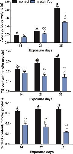Fig. 1. Average body weight, TG and T-CHO contents in X. laevis tadpoles exposed to metamifop for 14,21 and 35 days (Nâ=â3). abc: different letters represent statistically significant differences (SNK) at Pâ<â0.05, whereas the same letter indicates no significant difference. *âDenotes significant difference between control and treatments at Pâ<â0.05, ** denotes significant difference between control and treatments at Pâ<â0.01. Error bars indicate the standard deviation.