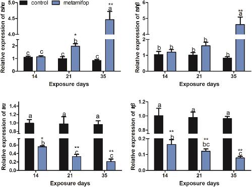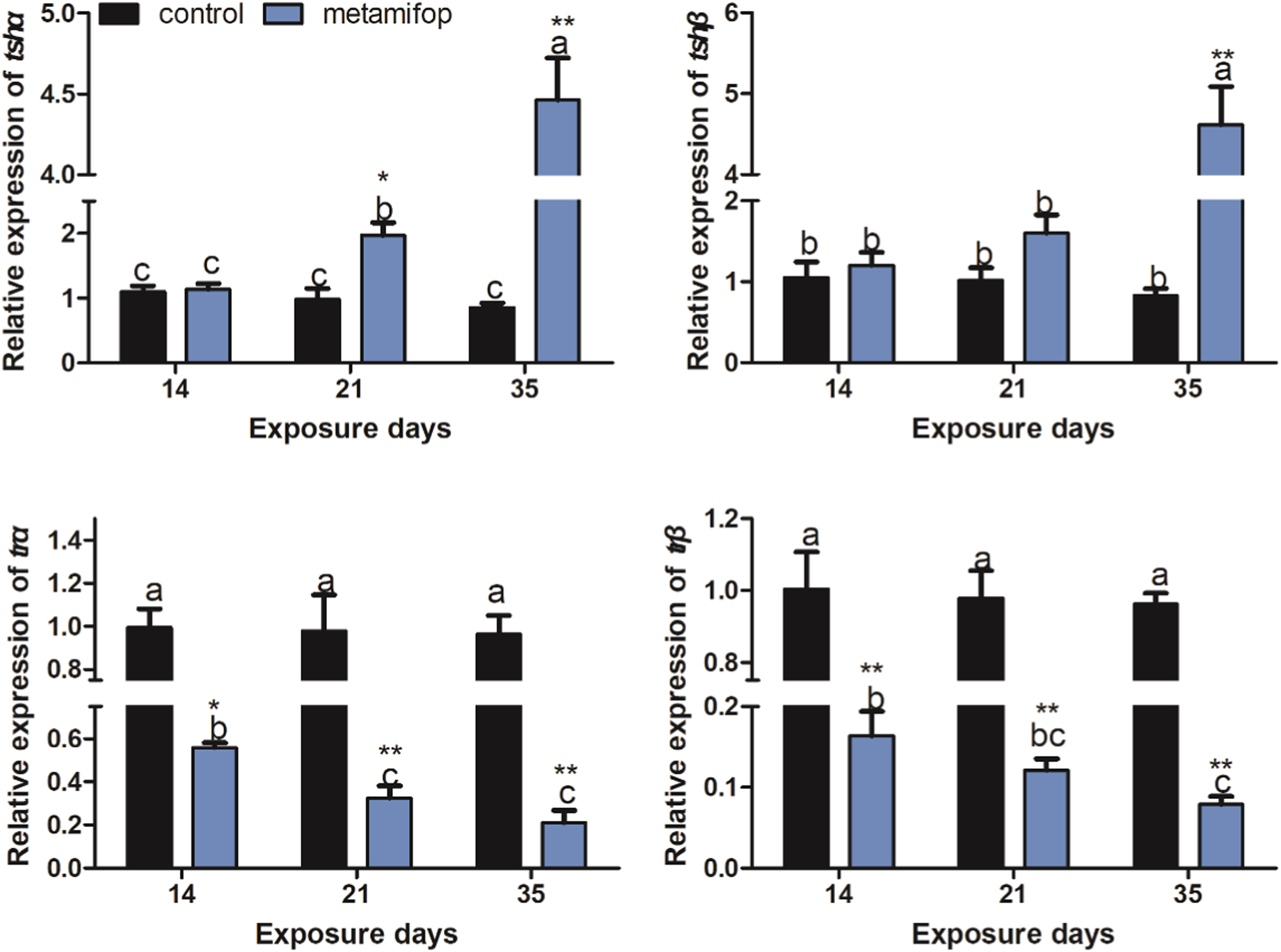 Fig. 4. The mRNA relative expression of thyroid stimulating hormone α (tshα), thyroid stimulating hormone β (tshβ), thyroid hormone receptors α (trâα) and thyroid hormone receptors β (trâβ) in X. laevis tadpoles exposed to metamifop for 14, 21 and 35 days. abc: different letters represent statistically significant differences (SNK) at Pâ<â0.05, whereas the same letter indicates no significant difference. *âDenotes significant difference between control and treatments at Pâ<â0.05, ** denotes significant difference between control and treatments at Pâ<â0.01. Error bars indicate the standard deviation.