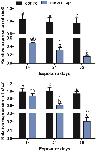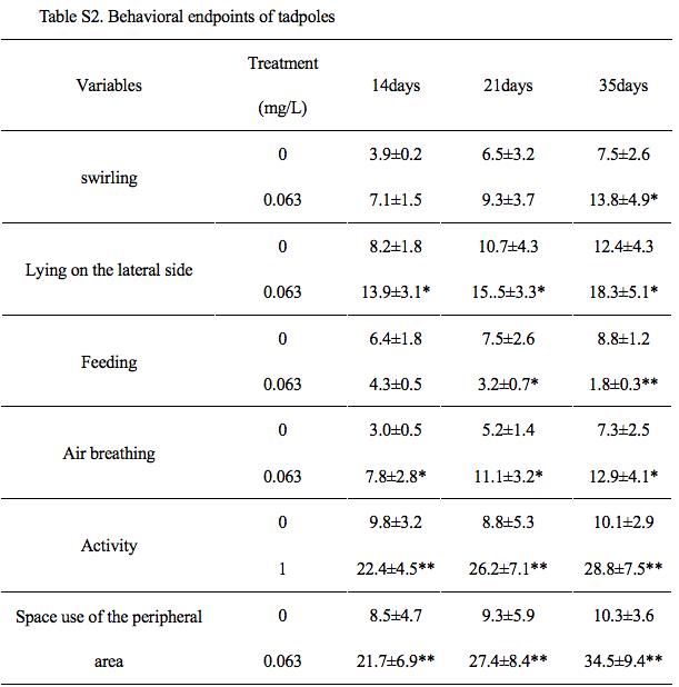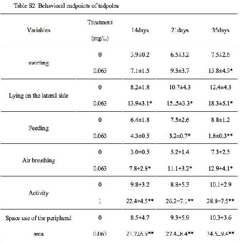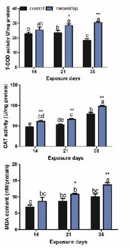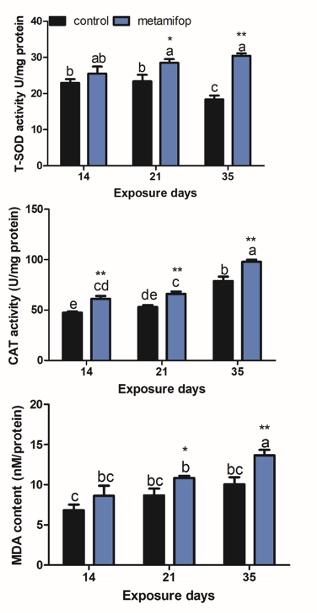 Figure S2. T-SOD and CAT activities and MDA content in X. laevis tadpoles exposed to metamifop for 14, 21 and 35 days. abc: different letters represent statistically significant differences (SNK) at P<0.05, whereas the same letter indicates no significant difference. * Denotes significant difference between the control and treatments at P<0.05, ** Denotes significant difference between the control and treatments at P<0.01. Error bars indicate standard deviation.