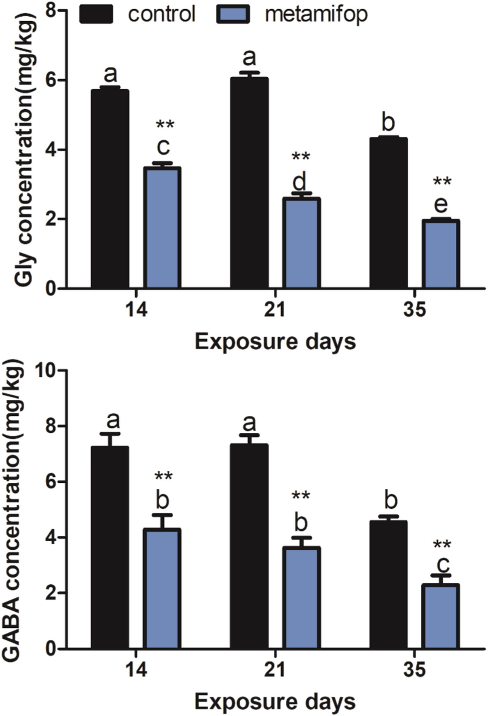 Fig. 2. Gly and GABA concentrations in X. laevis tadpoles exposed to metamifop for 14,21 and 35 days (Nâ=â3). abc: different letters represent statistically significant differences (SNK) at Pâ<â0.05, whereas the same letter indicates no significant difference. *âDenotes significant difference between control and treatments at Pâ<â0.05, ** denotes significant difference between control and treatments at Pâ<â0.01. Error bars indicate the standard deviation.