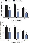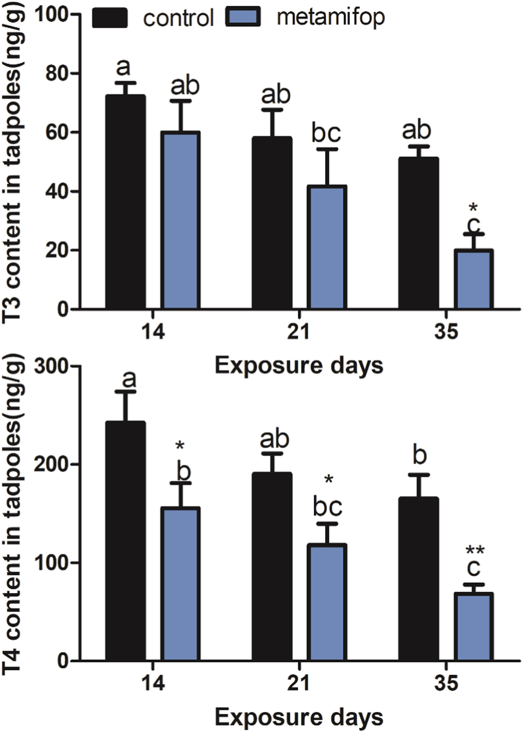 Fig. 3. T3 and T4 levels in X. laevis tadpoles exposed to metamifop for 14,21 and 35 days (Nâ=â3). abc: different letters represent statistically significant differences (SNK) at Pâ<â0.05, whereas the same letter indicates no significant difference. * Denotes significant difference between control and treatments at Pâ<â0.05, ** denotes significant difference between control and treatments at Pâ<â0.01. Error bars indicate the standard deviation.