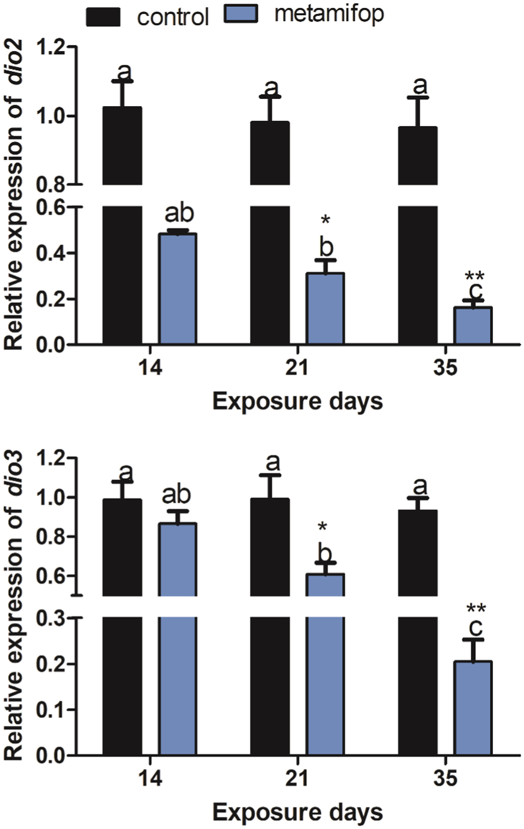 Fig. 5. The mRNA relative expression of type II deiodinase (dio2) and type III deiodinase (dio3) in X. laevis tadpoles exposed to metamifop for 14, 21 and 35 days. abc: different letters represent statistically significant differences (SNK) at Pâ<â0.05, whereas the same letter indicates no significant difference. *âDenotes significant difference between control and treatments at Pâ<â0.05, ** denotes significant difference between control and treatments at Pâ<â0.01. Error bars indicate the standard deviation.
