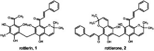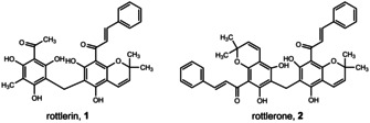 Figure 1. Structures of rottlerin (1) and rottlerone (2).