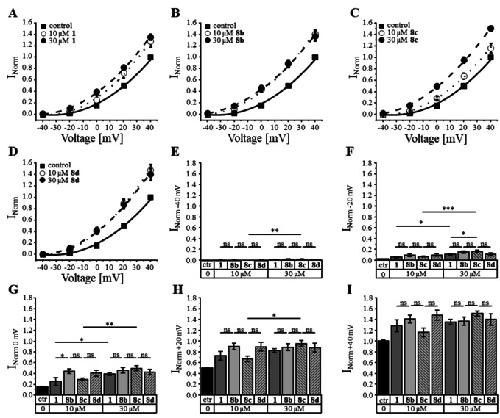 Figure 3. A)–D) Voltage dependent activation of KCNQ1/KCNE1 channels in absence (control, ctr) and presence of rottlerin (1) and analogs 8 b–d. Compounds were applied at 10 and 30 μM, and the effect on steady‐state activated current amplitude was assessed at different voltages. Current amplitudes were normalized to the mean of amplitudes at +40 mV in absence of test compounds (control) E)‐I) Mean of normalized current amplitudes±SEM of different voltage steps in absence (ctr) and presence of rottlerin (1) and 8 b–d. The number of independent experimental data points are given in Table 2. Significance of mean differences was determined by one‐way ANOVA and post‐hoc mean comparison Tukey test (ns: p>0.05, *p<0.05, **p<0.01, ***p<0.001).