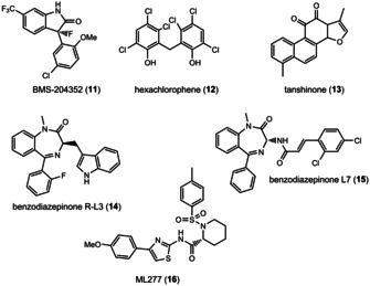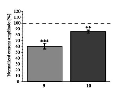 Figure 5. Normalized current amplitudes of KCNQ1/KCNE1‐expressing oocytes in the presence of 30 μM of compounds 9 and 10. The effect of derivatives on KCNQ1/KCNE1 currents was determined as described above and are shown as mean±SEM (n=9–12, unpaired t‐test **p<0.01, ***p<0.001).