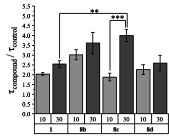 Figure 4. Relation of KCNQ1/KCNE1 deactivation time constants in the presence of rottlerin (1) and compounds 8 b–8 d (τ