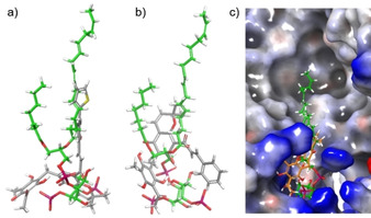 Figure 8. a) Superposition of thiophene rottlerin 8 d and PIP2. b) Superposition of rottlerin and PIP2. c) Orientation of rottlerin (orange) and PIP2 (green) in the Arg243 site. According to the cryo‐EM structure 6V01, PIP2 contains heptanoic acid in sn1 position and (5E,8E,11E,14Z)‐hexadecatetraenoic acid in position sn2.