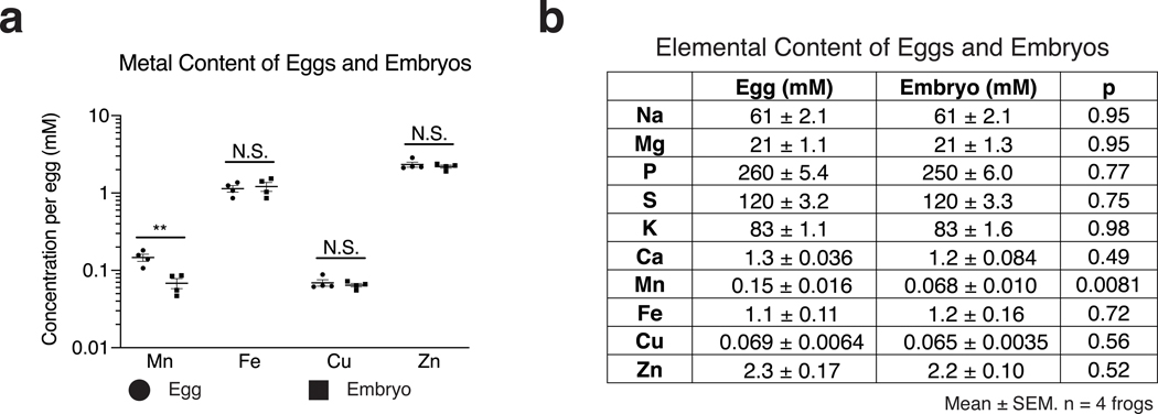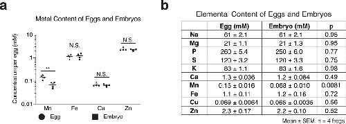 Figure 2:. Elemental analysis of eggs and embryos.ICP-MS measures a significant decrease in intracellular manganese post-fertilization. a. Metal concentrations of Xenopus eggs and embryos (1 hour post-fertilization) determined by ICP-MS. Intracellular Co and Ni are both below 13 μM. Data are presented as mean ± SEM per egg/embryo, **: p = 0.0081. Each point corresponds to ICP-MS analysis of a batch of 20 eggs normalized to a per egg basis. Similar results were obtained in 6 separate experiments (not shown). b. Elemental contents (mM) of Xenopus eggs and embryos (1-hour post-fertilization). Experimental conditions as in a. In both a. and b. n = samples from 4 separate frogs analyzed in a single ICP experiment. p is the significance of the change in elemental content following fertilization. Two-tailed, heteroscedastic T-tests were run between eggs and embryos in order to determine if there was a significant difference in metal content. No adjustments were made for multiple comparisons. |