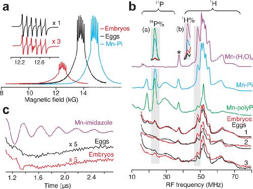 14N 3-pulse ESEEM timewaves of: eggs (black); embryos (red), each multiplied by 5 for ease of comparison; solution Mn-imidazole complex (purple). Experimental conditions: see Supplemental Methods (b, c, Fields ~ 12.5k G). In a., b., and c. n = 3 biologically independent replicates of intact frog eggs and embryos examined over 3 independent experiments. |