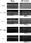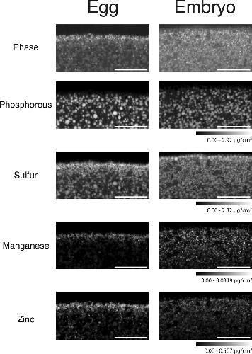 Figure 4:. Synchrotron-based X-ray fluorescence mapping of egg and embryo cortices.X-ray fluorescence microscopy images of the animal pole of fixed Xenopus egg/embryo slices show zinc and manganese are localized in small cortical compartments. Scale bar = 20 μm. Images acquired at Beamline 2-ID-D at Argonne National Laboratory. Pixel size: 300 à 300 nm, slice thickness: 2 μm, scan time: 500 ms/pixel. These are representative images of slices of eggs/embryos from 7 different frogs imaged over 3 experiments. |
