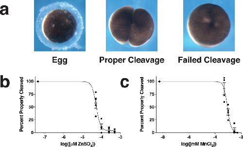Figure 7:. Extracellular zinc or manganese inhibits fertilization in a dose-dependent manner.Both extracellular zinc and manganese block fertilization. a. Images of an unfertilized Xenopus egg (in jelly coat), a properly dividing embryo (first cleavage), and an instance of failed cleavage (meiotic catastrophe). b. An IC50 graph of the effects of extracellular ZnSO4 on the rate of fertilization. IC50 = 53 μM (95% CI = 47 â 61 μM, R2 = 0.94). Data are presented as mean percentage of eggs properly fertilized ± SEM, n = 4 frogs (39 â 102 eggs per datapoint). See Supplemental Figure 11 for raw data. c. An IC50 graph of the effects of extracellular MnCl2 on the rate of fertilization. IC50 = 890 μM (95% CI = 770 μM â 1.0 mM, R2 = 0.93). Data are presented as mean percentage of eggs properly fertilized ± SEM, n = 4 frogs (36 â 100 eggs per datapoint). See Supplemental Figure 12 for raw data. |