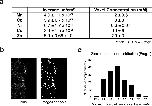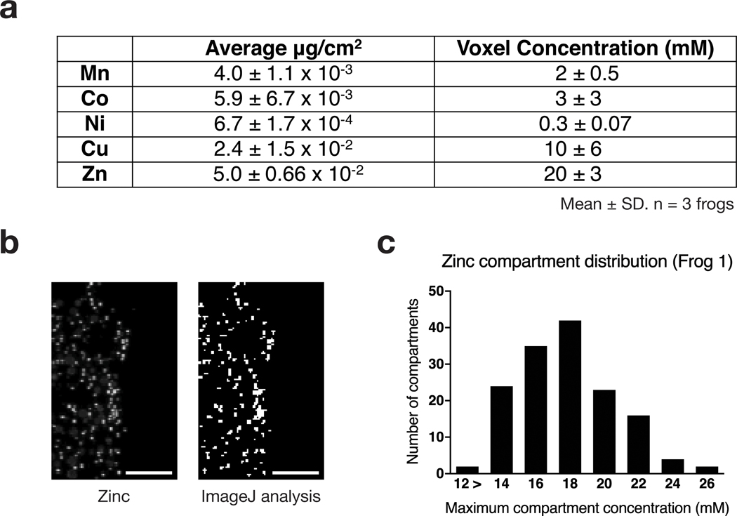 Figure 5:. Animal pole egg metal compartment contents.Metals are stored at millimolar concentrations in the cortical compartments. a. Concentrations of metal compartments in the egg animal pole. Voxel size 300 à 300 à 400 nm. Data acquired at Beamline 2-ID-D, Argonne National Laboratory. Values reported as mean ± SD, n = 3 slices of eggs analyzed from separate frogs examined over 2 independent experiments. b. Representative image of zinc distribution and thresholding of areas of high zinc concentration. Scale bar = 10 μm. Images acquired at Beamline 2-ID-D at Argonne National Laboratory. Pixel size: 300 à 300 nm, slice thickness: 400 nm, scan time: 500 ms/pixel. c. Representative plot of the zinc concentration distribution of small metal compartments found in a slice. n = 156 compartments. |
