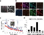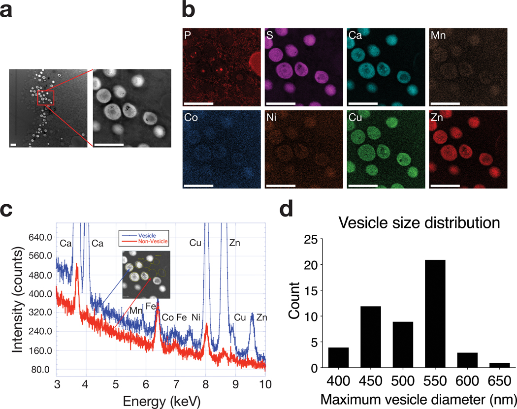 Figure 6:. Analytical electron microscopic analysis of egg animal pole cortical vesicles.AEM demonstrates that multiple metals are stored in sub-micrometer vesicles in the animal pole. a. High Angle Annular Dark Field Scanning Transmission Electron Microscopy (HAADF-STEM) images of the cortex of the animal pole of a fixed Xenopus egg. b. Hyperspectral elemental intensity distribution maps: background corrected, with a 0.7-pixel gaussian blur, no normalization, no quantification. Same conditions as in a. Scale bar = 1 μm in both a. and b. These are representative images of 3 separate scans. c. Cumulative XEDS spectra confirming the presence of Ca, Mn, Co, Ni, Cu, and Zn in vesicles. These comparison spectra are obtained by summing individual spectra from an identical number of pixels in regions of interest which correspond to vesicle and neighboring non-vesicle areas. d. Histogram of vesicle diameter distribution from image in a. n = 50 vesicles measured. |
