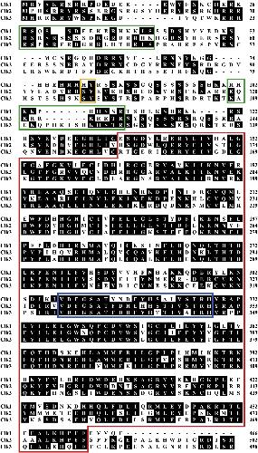 Putative nuclear localization signals, N-terminal phosphodegron sites, kinase domain, and activation loop are indicated by green, yellow, red, and blue boxes, respectively. Amino acid residues that are conserved between at least two of the sequences are shaded in black. Sequence alignment was performed using the Clustal W method. (For interpretation of the references to colour in this figure legend, the reader is referred to the Web version of this article.) |