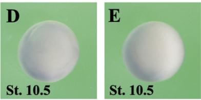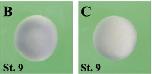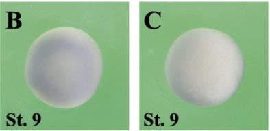 clk1 (CDC like kinase 1) gene expression In a Xenopus laevis embryo, NF stage 9, assayed via in situ hybridization, animal view (B) and vegetal view (C). |
