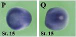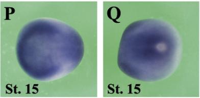 clk3 (CDC like kinase 3) gene expression In a Xenopus laevis embryo, NF stage 15, assayed via inbsitu hybridization, dorsal (P) and posterior dorsal (Q) view |