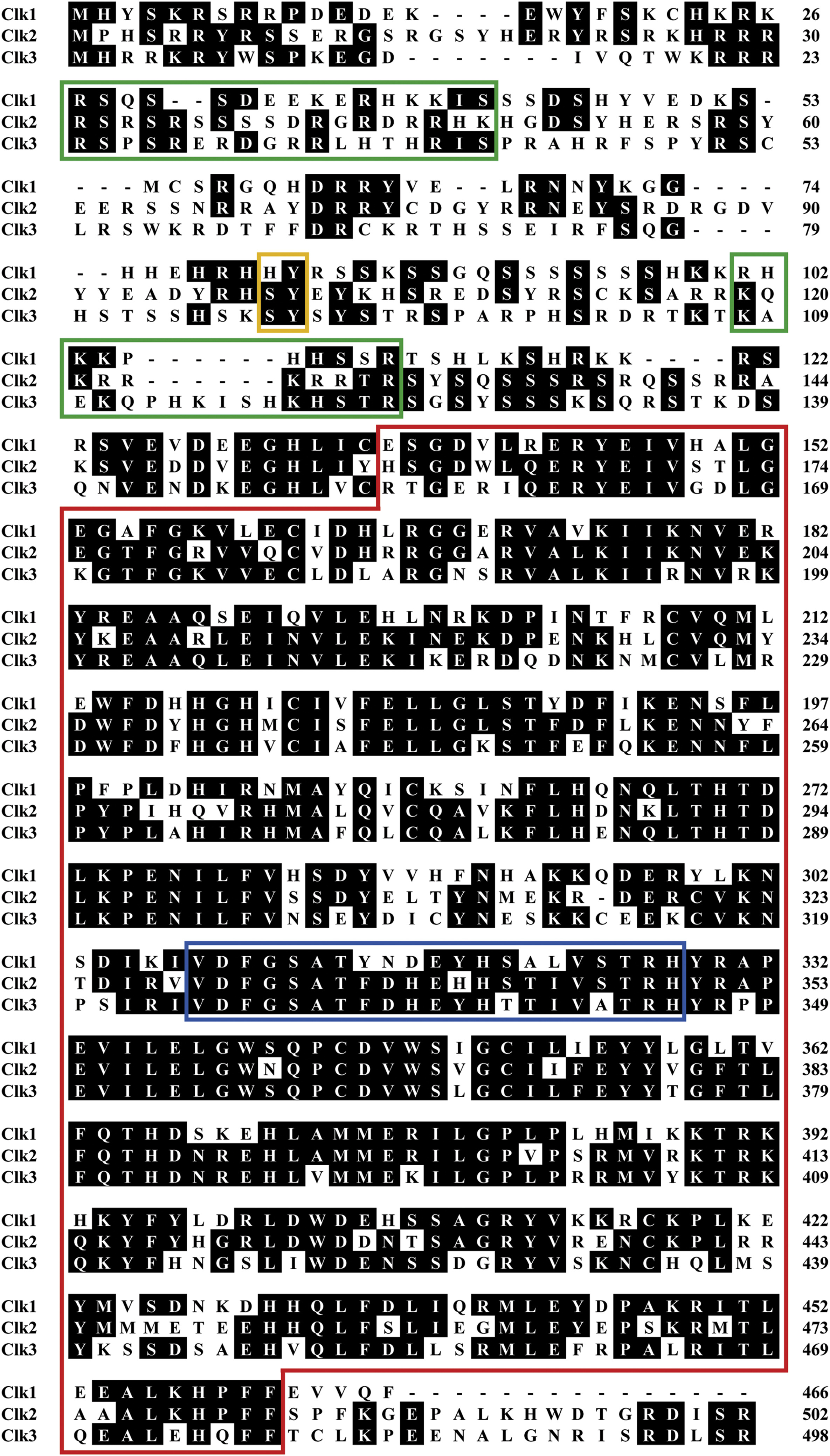 Putative nuclear localization signals, N-terminal phosphodegron sites, kinase domain, and activation loop are indicated by green, yellow, red, and blue boxes, respectively. Amino acid residues that are conserved between at least two of the sequences are shaded in black. Sequence alignment was performed using the Clustal W method. (For interpretation of the references to colour in this figure legend, the reader is referred to the Web version of this article.) |
