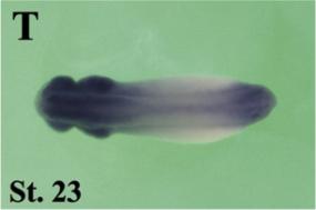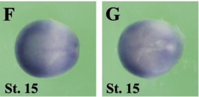 clk1 (CDC like kinase 1) gene expression In a Xenopus laevis embryo, NF stage 15, assayed via insitu hybridization, dorsal (F) and posterior-dorsal view (G), anterior left. |