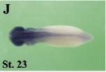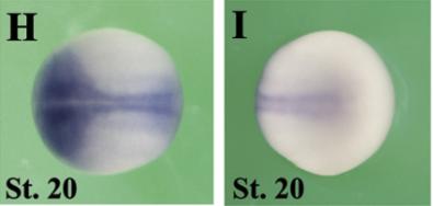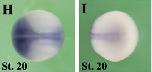 clk1 (CDC like kinase 1) gene expression In a Xenopus laevis embryo, NF stage 20, assayed via insitu hybridization, dorsal (H) and posterior-dorsal (I) view, anterior left. |