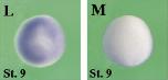 clk3 (CDC like kinase 3) gene expression In a Xenopus laevis embryo, NF stage 9, assayed via in situ hybridization, animal view (L) and vegetal view (M). |