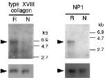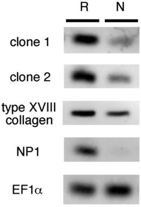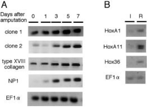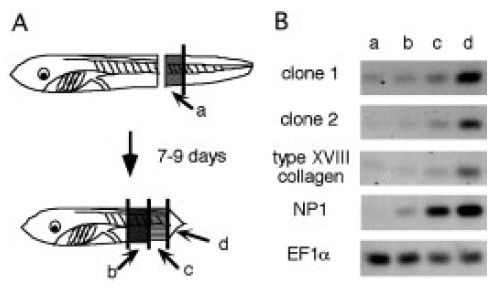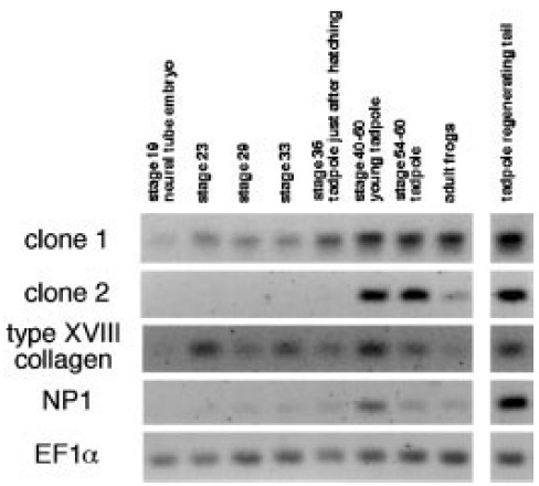 To identify candidate gene(s) involved in the tail regeneration of Xenopus laevis tadpoles, we used the differential display method to isolate four genes (clones 1, 2, 13a, and 13b) whose expression is induced in regenerating tadpole tails. Among them, clones 13a and 13b were found to encode the Xenopus homologues of the alpha1 chain of type XVIII collagen and neuronal pentraxin I, respectively. Expression of clone 2 and neuronal pentraxin I genes increased dramatically in the blastema 3 days after amputation, whereas that for the clone 1 and type XVIII collagen genes was induced gradually after amputation. In situ hybridization revealed that the neuronal pentraxin I gene is expressed specifically in the regenerating tailepidermis but not in the normal tailepidermis or the most distal margin of the tail blastema, suggesting that it has a tissue-inductive role in tail regeneration. Expression of the four genes was induced in the limb and in the tail blastema, suggesting that they are involved in the regeneration of both organs. Finally, expression of clone 2 and neuronal pentraxin I genes was scarce during embryonic stages in comparison to the tail blastema, suggesting that their main functions are in organ regeneration. Our results demonstrate unique features of spatial and temporal gene expression patterns during Xenopus tadpoletail regeneration.