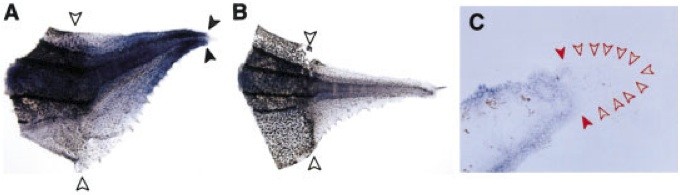 Fig. 6. Whole-mount in situ hybridization of the Xenopus NP1 gene in the regenerating tadpole tails. A,B: Whole-mount in situ hybridization was performed using Xenopus tadpole regenerating tails 7 days after amputation and antisense (A) or sense (B) digoxigenin- labeled RNA probes. The boundary between the normal tail portions and the regenerating tail is indicated by white arrowheads, and the boundary between the regenerating tail and the most distal portions is indicated by black arrowheads. C: The tadpole regenerating tail specimen stained by whole-mount in situ hybridization was sectioned to observe the inner tissues. The boundary between the most distal tip without NP1 expression (right) and the NP1-expressing regenerating tail (left) is indicated by filled red arrowheads. The portion corresponding to the distal tip is outlined by open red arrowheads.