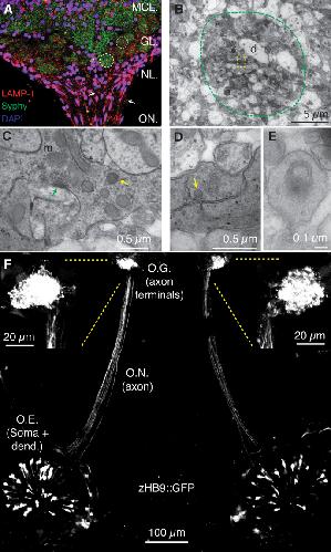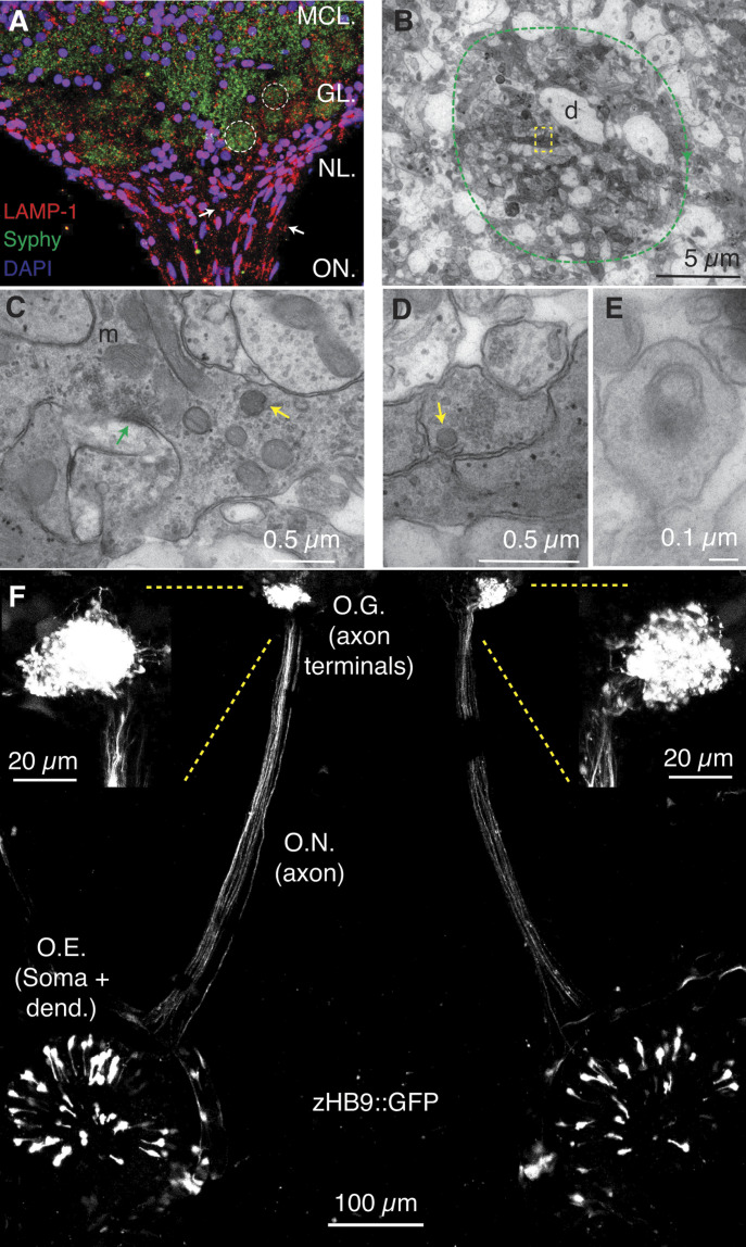 Figure 1. The endolysosomal system is present in axon terminals of olfactory sensory neurons (OSNs) of Xenopus tropicalis tadpoles.(A) Image of the olfactory bulb of a X. tropicalis tadpole stained with LAMP-1, an endolysosomal marker. LAMP-1 was present in axons (arrows) of OSNs entering the olfactory bulb, as well as in olfactory glomeruli, which were revealed by the accumulation of the synaptic vesicle protein synaptophysin (dotted circles). Axon terminals of OSNs form the presynaptic element of olfactory glomeruli. DAPI was used to reveal the position of cell nuclei. The image shows three regions of the olfactory bulb: nerve layer, glomerular layer, and the rostral portion of the mitral cell layer. Part of the olfactory nerve is also visible. (B). Transmission electron microscopy images allowed the observation of olfactory glomeruli (dotted circle). Axon terminals appeared as electrodense processes contacting dendrites (d). (C) The presynaptic compartment of OSNs is long, tortuous, and contains a large pool of cytoplasmic vesicles that acts as a reservoir of active zones (green arrow). Mitochondria (m) and late endosomes (yellow arrow) are present in the cytosol. (D) Detail of the boxed region in (B) indicating the presence of a lysosome (arrow). (E) Some autophagophores were also present in OSN presynaptic terminals. (F) Visualization of the entire morphology of OSNs in a zHB9::GFP X. tropicalis tadpole anesthetized and embedded in agarose. It is possible to observe the entire morphology of a population of GFP positive OSNs that project to a single glomerulus. Cell bodies are located in the olfactory epithelium (O.E). Axons travel along the olfactory nerve and give rise to two symmetrical olfactory glomeruli (O.G.) in the olfactory bulbs. |