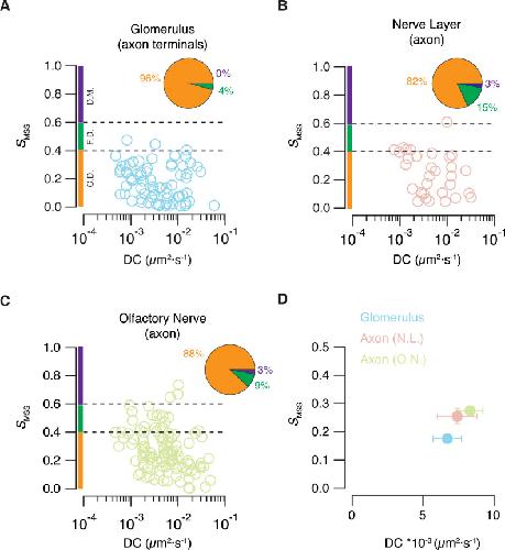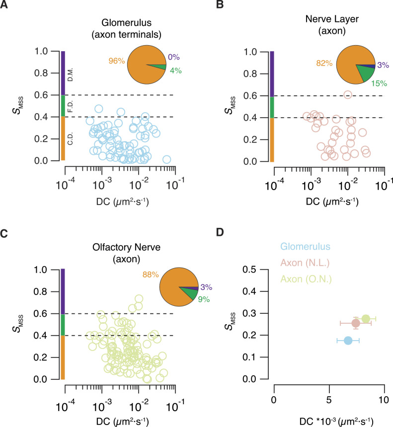 Figure 3. Mobility of endolysosomes found in presynaptic and axonal compartments.(A, B, C) Plot of the slope of the moment scaling spectrum (SMSS) against the diffusion coefficient (D.C.) of acidic organelles located in three different layers of the olfactory system. SMSS values found between 0.4 and 0.6 are associated to free diffusion (F.D., dotted lines), whereas SMSS values <0.4 or >0.6 are indicative of confined diffusion (C.D.) or directed motion (D.M.), respectively. Almost all acidic organelles present in presynaptic terminals move by confined diffusion. Free diffusion and directed motion are present in axonal regions. (D) Mean SMSS and diffusion coefficient values for acidic organelles found in the glomerular layer (n = 82), nerve layer (n = 40) and the olfactory nerve (n = 118, seven tadpoles). Error bars indicate SEM. |