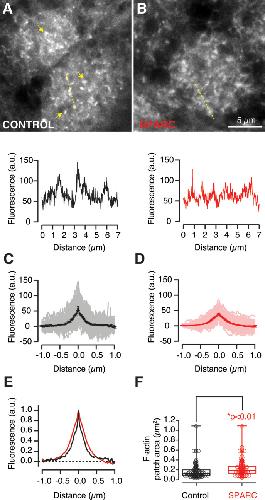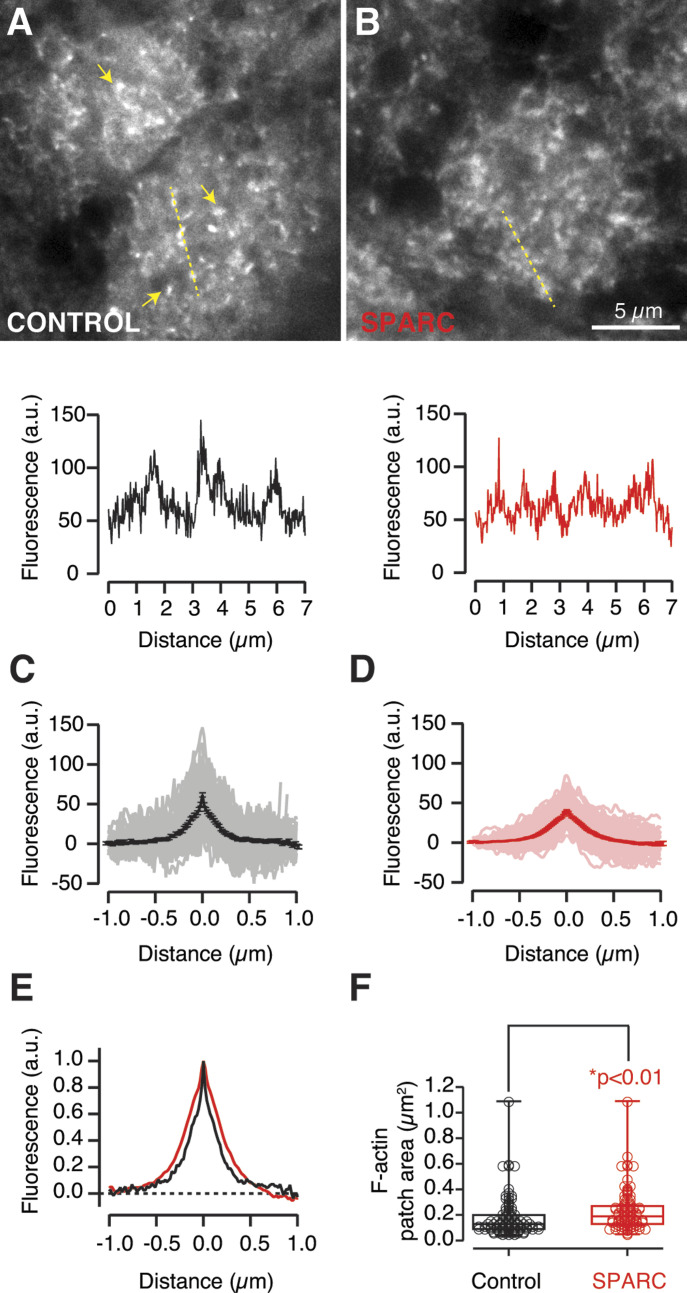 Figure 6. Secreted protein acidic and rich in cysteine (SPARC) alters the structure of F-actin patches present in olfactory glomeruli.(A) F-actin patches (arrows) were present in olfactory glomeruli (up). Plot of Intensity profiles (dotted yellow line) used to estimate the width and maximum fluorescence of the structures identified (down). (B) SPARC disrupted the appearance of F-actin patches by increasing their area and reducing their fluorescence peak. (C, D) Average intensity profiles from F-actin patches obtained in control condition (C, n = 92) or in tadpoles injected with 50 μM SPARC (D, n = 137). Solid lines and error bars indicate mean ± SEM obtained from the individual traces shown. (E) Normalized average intensity profiles showing an increase in the width of F-actin patches in tadpoles injected with SPARC (red) compared with control animals (black). (F) Comparison of the area covered by F-actin patches in the olfactory glomeruli of control (black, n = 104) and SPARC injected tadpoles (red, n = 95). Box plots show the median (horizontal line), 25â75% quartiles (boxes), and ranges (whiskers) of the area of F-actin patches. The difference between the two groups was established by the t test. |