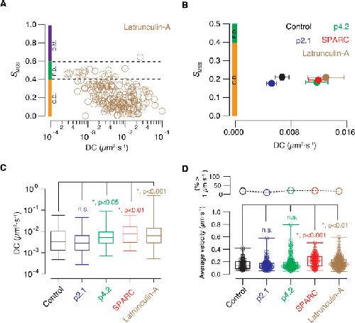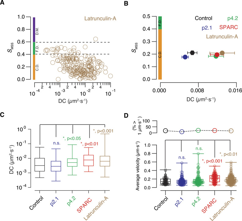 Figure 7. The diffusion coefficient of endolysosomes found in axon terminals is increased during synaptic remodelling.(A) Acute effect of 50 μM latrunculin-A on the mobility of acidic organelles present in presynaptic terminals. Plot of the slope of the moment scaling spectrum (SMSS) against the diffusion coefficient (DC) of particles labelled with lysotracker deep red. SMSS values found between 0.4 and 0.6 are associated to free diffusion (F.D., dotted lines), whereas SMSS values <0.4 and >0.6 are indicative of confined diffusion (C.D.) and directed motion (D.M.), respectively. (B) Relationship between the SMSS and the DC of acidic organelles found in axon terminals of olfactory sensory neurons in five different experimental conditions. Dots indicate mean ± SEM obtained in the indicated groups. Control (n = 75, 8 tadpoles), p2.1 (n = 67, 8 tadpoles), p4.2 (n = 143, 6 tadpoles), full-length secreted protein acidic and rich in cysteine (SPARC, n = 72, 10 tadpoles), and latrunculin-A (n = 209, 14 tadpoles). Each dot indicates mean ± SEM. Colored bars indicate the ranges of SMSS values associated to confined diffusion (C.D.) and free diffusion (F.D.). (C) Box plots show the median (horizontal line), 25â75% quartiles (boxes), and ranges (whiskers) of DCs found for presynaptic acidic organelles in the five experimental groups showed in [B]. Statistical differences were established using the KruskalâWallis test followed by Dunnâs multiple comparisons test. (D) Box plots show the median (horizontal line), 25â75% quartiles (boxes), and ranges (whiskers) of the average velocity of presynaptic acidic organelles found in the five experimental groups showed in [B]. Statistical differences were established using KruskalâWallis test followed by Dunnâs multiple comparisons test. The percentage of particles reaching velocities >1 μm·sâ1 in each experimental group is indicated in the upper plot. |