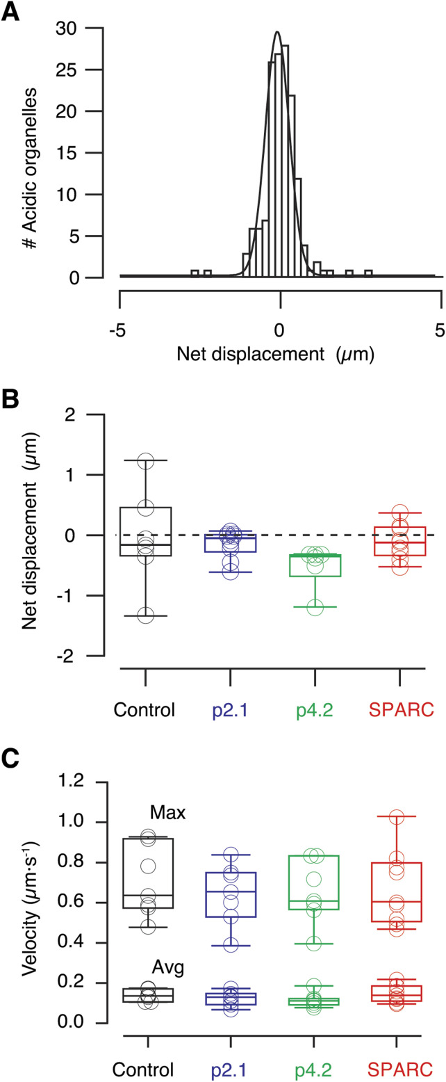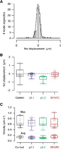 Figure 9. Axonal transport of endolysosomes is not affected by synaptic remodelling.(A) Histogram of net displacements of all acidic organelles found in the olfactory nerve (ON) of a control tadpole occurring in a time interval of 200 s (n = 152). Negative values indicate retrograde transport and positive values indicate anterograde transport. A Gaussian fit was used to obtain the mean value of particle displacements, which in this example was of â0.105 μm. This distance was considered a quantitative indicator of the balance between retrograde and anterograde transport of endolysosomes in the ON and was representative of a given tadpole. (B) No differences (one-way ANOVA analysis followed by Dunnettâs multiple comparisons test) were found among the mean, net representative displacements of acidic organelles present in the ONs in the indicated experimental conditions. Control (n = 7 tadpoles), p2.1 (n = 7 tadpoles), p4.2 (n = 7 tadpoles), full-length secreted protein acidic and rich in cysteine (SPARC, n = 9 tadpoles). (C) No differences (one-way ANOVA analysis followed by Dunnettâs multiple comparisons test) were found in the average velocity nor the maximum velocity of endolysosomes present in the ONs in the indicated experimental conditions. Control (n = 7 tadpoles), p2.1 (n = 7 tadpoles), p4.2 (n = 7 tadpoles), and SPARC (n = 9 tadpoles). |