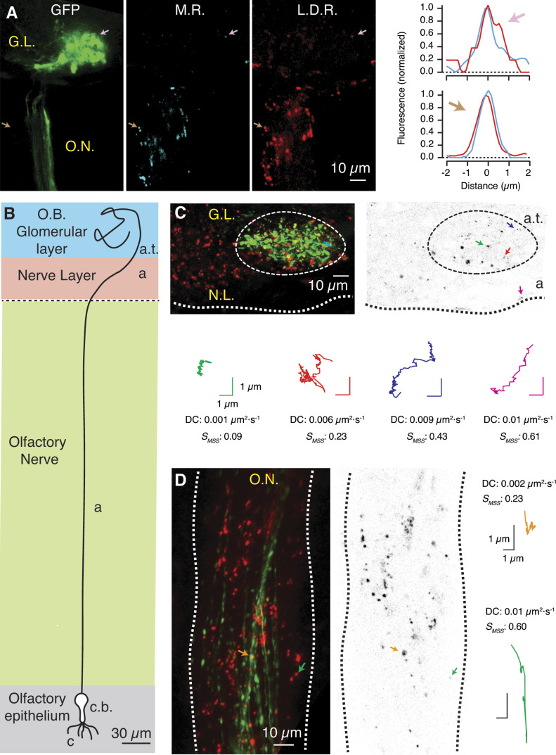 Figure 2. Tracking the mobility of endolysosomes in olfactory sensory neurons in vivo.(A) Puncta stained with lysotracker deep red (L.D.R, red) co-localized with the product of the hydrolysis of magic red cathepsin-B (M.R., blue). The arrows indicate the line profiles of two acidic organelles located in the periphery of the GFP labelled glomerulus (arrow, magenta) and in an axonal region (arrow, brown). (B) Schematic morphology of a Xenopus tropicalis tadpole olfactory sensory neuron. The anatomical regions are indicated. Cilia (c), cell body (c.b.), axonal region (a) which comprises the olfactory nerve (ON) tract and the nerve layer (NL) of the olfactory bulb, and axon terminals forming glomeruli (a.t.). (C) Maximum intensity projection (left) and single confocal section (right) of the olfactory bulb. The mobility of acidic organelles (red staining) was evaluated separately in axon terminals originating the GFP-positive glomerulus (dotted circle) and in the NL of the olfactory bulb. The SMSS and the diffusion coefficient were calculated for puncta that fulfilled the analysis criteria (see the Materials and Methods section for details). Mobility tracks are indicated for three glomerular acidic organelles (red, green, and blue traces) and one acidic organelle of the NL (magenta). (D) Maximum intensity projection (left) and single confocal section (right) of a region of an ON. Acidic organelles found in the ON moved by confined diffusion (orange trace) and directed motion (green trace). Notice the presence of a population of GFP labelled axons, a characteristic of the zHB9::GFP X. tropicalis line. |