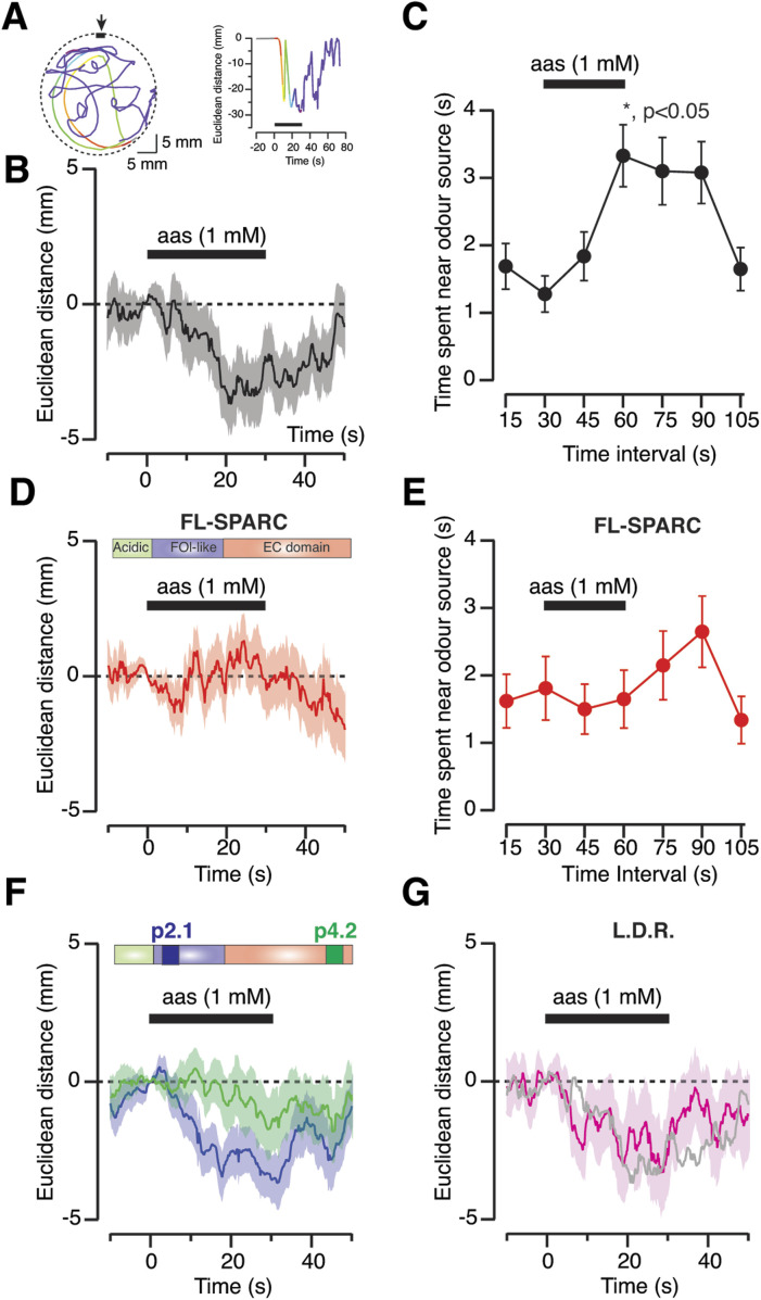 Figure 4. Microinjection of secreted protein acidic and rich in cysteine (SPARC) in the olfactory bulb disrupts olfactory-guided behaviour.(A) Xenopus tropicalis tadpoles are attracted by local delivery of a 1 mM mixture of five different amino acids (methionine, leucine, histidine, arginine, and lysine), which act as waterborne odorants. Changes in the Euclidean distance found between the animal and the nozzle (arrow) delivering the odorants set the bases for quantifying olfactory-guided behaviour. For analysis, all tadpoles are considered to be 0 mm away from the odour source just before exposure to odorants. Negative distance values show attraction, whereas positive values indicate repulsion. (B) Average response of control tadpoles to local delivery of the amino acid solution (n = 72). Solid line and shadowed area indicate mean Euclidean distance and SEM, respectively. (C) Quantification of the time spent in the vicinity of the odour source (see the Materials and Methods section for details). The attraction for waterborne odorants is transient and occurs from 15 to 30 s after amino acids start to flow into the well (*P < 0.05, KruskalâWallis t test followed by Dunnâs multiple comparisons test). Dots indicate mean ± SEM (n = 72). (D) Average olfactory-guided response of tadpoles 5 h after injection of 50 μM full-length recombinant SPARC in the olfactory bulb (n = 78). Solid line and shadowed area indicate mean ± SEM changes in the Euclidean distance separating the animal and the nozzle delivering the amino acids. (E) Tadpoles injected with full-length SPARC are not attracted by waterborne odorants. Dots indicate mean ± SEM (n = 78). (F) Average olfactory guided response of tadpoles 5 h after injection of 500 μM peptide p4.2 (n = 51) or 500 μM peptide p2.1 (n = 54) in the olfactory bulb. Both peptides contain 20 amino acids found in the illustrated regions of SPARC. Peptide 4.2 displays an analogous activity to the full-length protein. Peptide 2.1 is inactive and is used as a control of injection. Solid line and shadowed area show mean ± SEM changes in Euclidean distance. (G) Labelling of olfactory sensory neurons with lysotracker deep red did not alter olfactory-guided behaviour (n = 58). Solid line and shadowed area indicate mean ± SEM changes in Euclidean distance. The grey trace indicates the control response (from B) for comparison purposes. |
