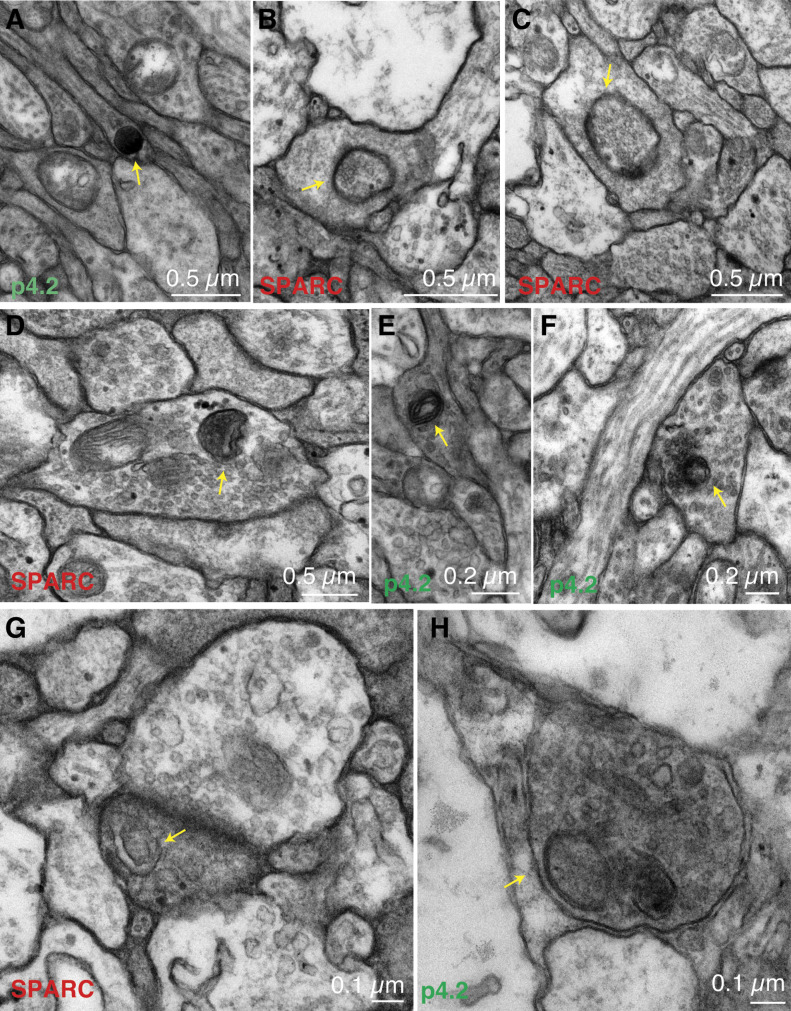 Figure 5. Presence of multiple organelles of the endolysosomal system in axon terminals of olfactory sensory neurons during synaptic remodelling.(A, B, C, D, E, F, G) Presynaptic terminals forming olfactory glomeruli were inspected for the presence of components of the endolysosomal system upon exposure to full-length secreted protein acidic and rich in cysteine (SPARC) or its active peptidic fragment p4.2. Lysosome (A, arrow), late endosomes (B, C, arrows), endolysosomes (D, E, arrows), and autophagic intermediates (F, G, arrows). (H) Retraction bulb (arrow) suggesting an ongoing elimination of synaptic contacts. |
