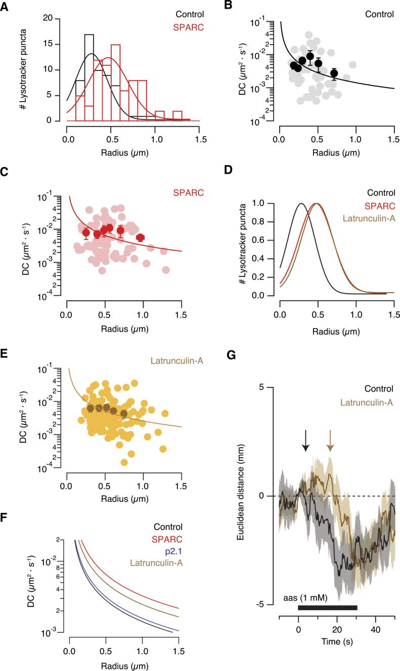 Figure 8. The increase in the mobility of presynaptic endolysosomes is associated to changes in the viscosity of the cytosol.(A) The radius of presynaptic endolysosomes increased when full-length secreted protein acidic and rich in cysteine (SPARC) triggered the remodelling of synaptic connectivity. Control (n = 60, eight tadpoles) and SPARC-injected tadpoles (n = 72, ten tadpoles) (B, C). The diffusion coefficient decreased as a function of the radius of puncta labelled with lysotracker deep red. Fitting of individual values to the StokesâEinstein equation revealed that the viscosity (η) of 0.15 Pa·s found in axon terminals decreased to 0.066 Pa·s after the glomerular layer was exposed to SPARC. Bins indicate mean ± SEM. and dots show individual values. (D) Normalized Gaussian fits show that latrunculin-A and SPARC increased the size of acidic organelles compared to control conditions. (E) Latrunculin-A reduced the viscosity of the presynaptic cytosol to 0.085 Pa·s. Bins indicate mean ± SEM and dots show individual values. (F) Microinjection of the inactive SPARC derived peptide, p2.1, did not alter the viscosity of the presynaptic compartment (η = 0.14 Pa·s). Fits obtained in (B, C, E) are included for comparison purposes. (G) Average olfactory guided response (n = 56) of tadpoles injected with 50 μM latrunculin-A to local delivery of a 1 mM mixture of 5 different amino acids (methionine, leucine, histidine, arginine, and lysine). Solid line and shadowed area indicate mean Euclidean distance and SEM, respectively. The control response of non-injected animals is displayed for comparison purposes. Arrows show the time of initiation of the movement towards the odour source. Notice the delay present in tadpoles injected with latrunculin-A (time between arrows). |
