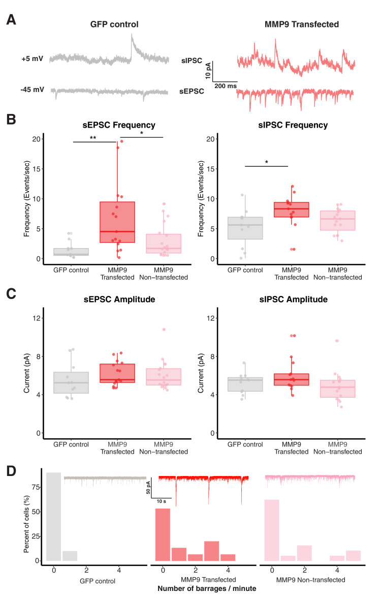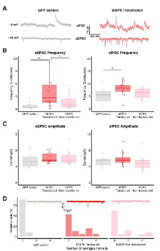 Figure 1. MMP-9 overexpression increases spontaneous synaptic activity and network connectivity.(A) Representative sEPSCs and sIPSCs recorded at −45 mV and +5 mV, respectively, from control and MMP-9 transfected cells. (B) Boxplots showing frequency of sEPSCs and sIPSCs for GFP control, MMP-9 transfected and MMP-9 non-transfected groups. The sEPSC and sIPSC frequencies are significantly enhanced in the MMP-9 transfected cells in comparison to the GFP control. Each dot represents data from one cell, the box represents median and interquartile range (IQR) and whiskers represent the range of data. (C) Box plot showing sEPSC and sIPSC amplitudes for each group. The sEPSC and sIPSC amplitudes do not vary significantly between control, MMP-9 transfected and MMP-9 non-transfected groups. Data are represented as median ± IQR. (D) Histogram showing relative barrage frequency for each group. The inset shows representative traces of barrages from each experimental group. MMP-9 transfected and non-transfected groups showed a higher number of barrages (recorded at −45 mV) than the GFP control group. * p < 0.05, ** p < 0.005. Figure 1—source data 1. MMP9 overexpression data. |