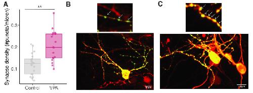Figure 2—figure supplement 1. Exposure to VPA results in increased synapse density.(A) Box plot showing synapse density for control and VPA groups. VPA exposed tadpoles showed increased synapse density compared to control group. (B) Representative image from control animal expressing punctate PSD95-GFP (green) and pcDNA-mCherry (red). Upper image shows a magnified dendritic branch. (C) Representative image from VPA-exposed animal expressing punctate PSD95-GFP (green) and pcDNA-mCherry (red). Upper image shows a magnified dendritic branch with increased synapse density., ** p < 0.005. Figure 2—figure supplement 1—source data 1. PSD95 overexression source data. |