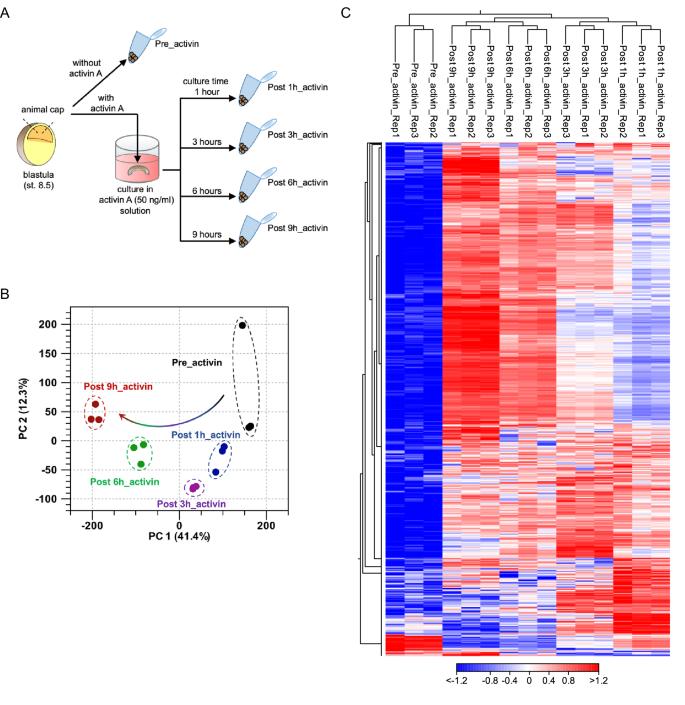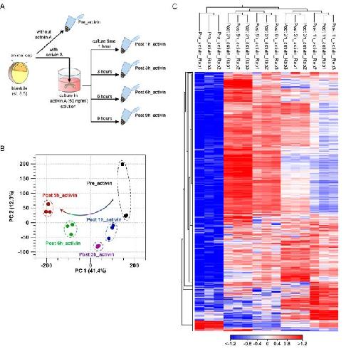 Figure 1. Transcriptomic relationships among AC samples. (A) Overview of the sample preparation for a time-course RNA-seq. ACs were collected without activin A treatment (Pre_activin), and after activin A treatment for 1, 3, 6 and 9 h (Post 1h_activin, Post 3h_activin, Post 6h_activin, and Post 9h_activin). (B) Principal component analysis (PCA) of ACs. The first two principal components PC1 and PC2 represented 53.7% of the total variance. Each dot denotes a single biological replicate, and dashed circles represent three replicates for each individual sample. Black dot, Pre_activin; blue dot, Post 1h_activin; purple dot, Post 3h_activin; green dot, Post 6h_activin; red dot, Post 9h_activin. (C) Hierarchical clustering of the expression profiles between Pre_activin and Post_activin groups. Individual samples are shown in columns, and genes in rows. The upper axis shows the clusters of samples, and the left vertical axis shows clusters of genes. The heatmap represents relative expression (red, high; white, intermediate; blue, low expression). Rep1-3; the biological replicate 1â3. The heatmap was visualized using the CLC Genomic Workbench software 12.0 (QIAGEN). |