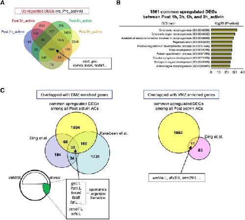 Figure 3. Common upregulated DEGs among Post_activin samples. (A) Venn diagrams showing overlap among upregulated DEGs. The numbers of common and unique upregulated DEGs are displayed in colored ellipses. Known activin responsive genes are listed as indicated. (B) Gene ontology (GO) enrichment analysis of 1861 common upregulated DEGs between Post 1 h, 3 h, 6 h, and 9h_activin. The top ten enriched GO terms in biological processes, and the -log10 (P-value) of the significant GO terms are displayed in order of significance from the bottom of the list. (C) Left Venn diagram showing the comparison of DMZ-enriched genes at stage 10.5 (Ding et al.), those at stage 11 (Kakebeen et al.) and common upregulated DEGs among all Post_activin samples. The representatives of overlapping genes among three studies are indicated. Right Venn diagram showing the comparison of VMZ-enriched genes at stage 10.5 (Ding et al.) and common upregulated DEGs among all Post_activin samples. The numbers of common and unique genes in independent studies are displayed in colored circles.